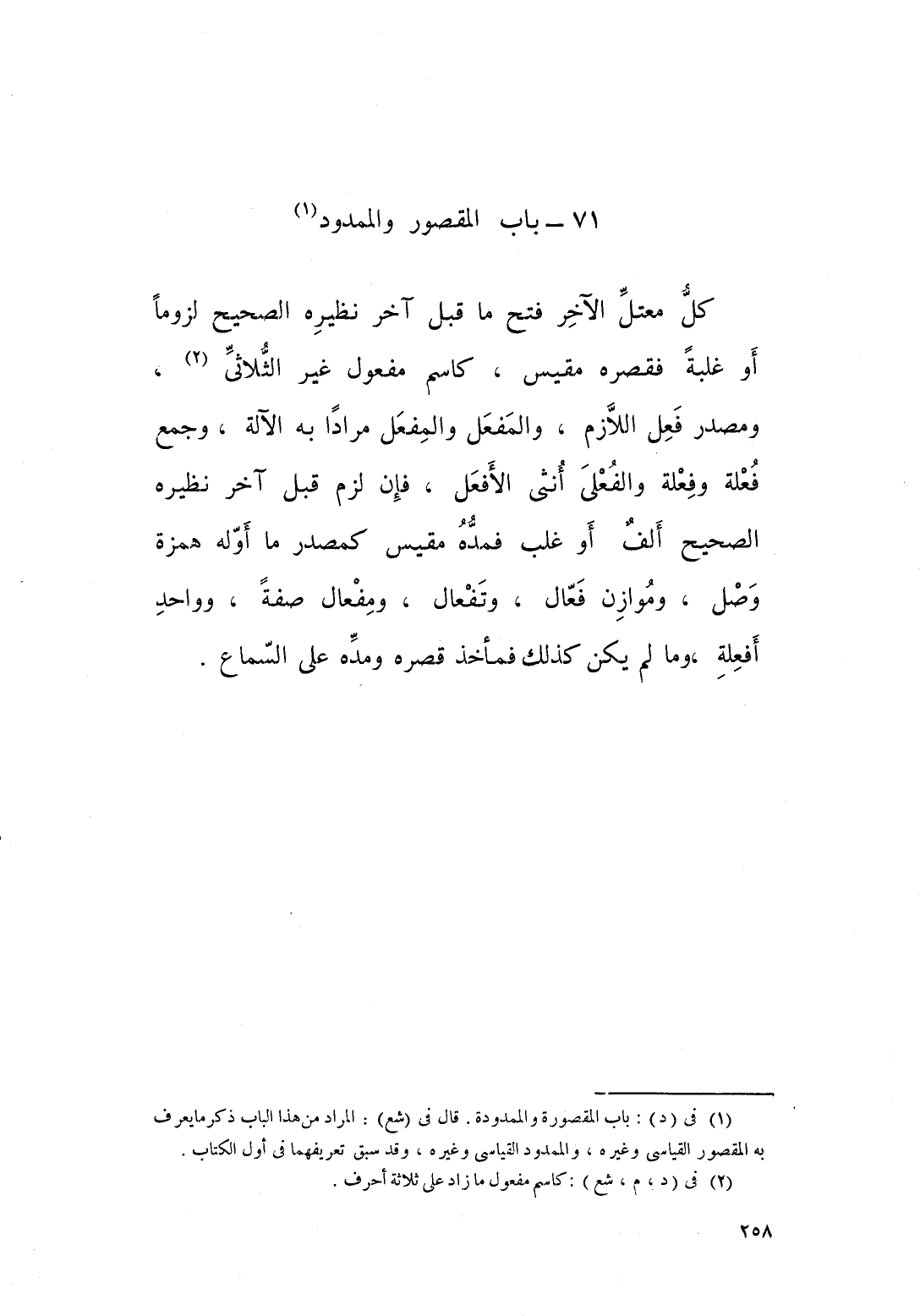 / كل معتل الاخر فتح ما قبل اخر نظيره الصحيح لزوما او غلبة فقصره مقيس، كاسم مفعول ما زاد على ثلاثة احرف، ومصدر فعل اللازم، والمفعل والمفعل مرادا به الالة وجمع فعلة وفعلة والفعلى انثى الافعل، فإن لزم قبل اخر نظيره الصحيح الف، او غلب فمده مقيس كمصدر ما اوله همزة وصل، وموازن فعال وتفعال ومفعال صفة وواحد افعلة، وما لم يكن كذلك فمأخذ قصره ومده على السماع.
