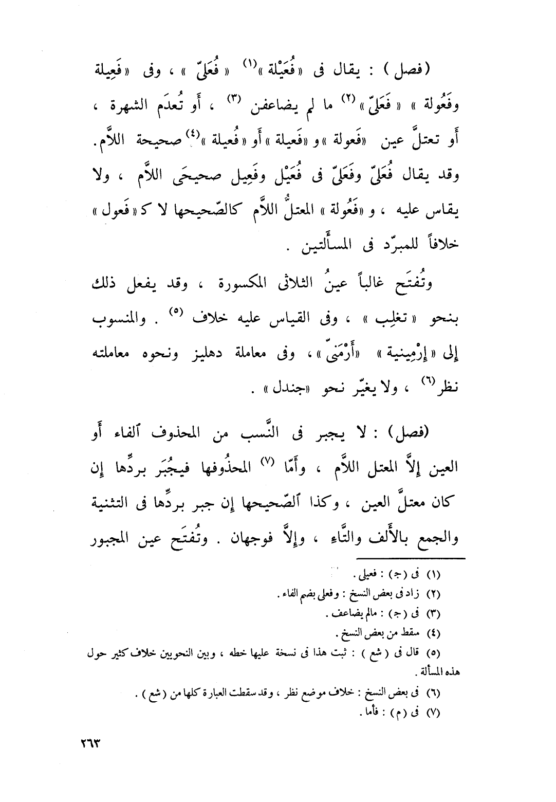 وتفتح غالبا عين الثلاثي المكسورة، وقد يفعل ذلك نحو: تغلب، وفي القياس عليه خلاف والمنسوب الى ارمينية ارمني، وفي معاملة دهليز ونحوه معاملته نظر، ولا يغير، نحو: جندل.