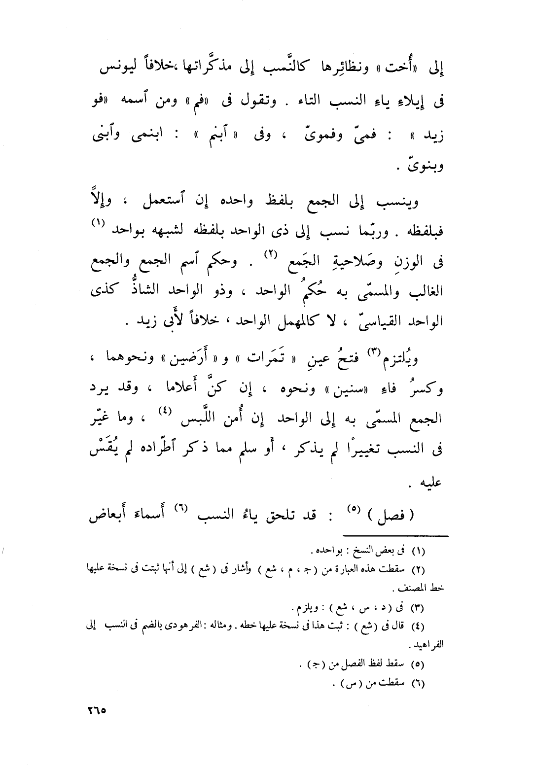 وتقول في “ فم “ ومن اسمه “ فو زيد “: فميو فموي، وفي “ ابنم “: “ ابنمي “ و “ ابني “ و “ بنوى “. وينسب الى الجمع بلفظ واحده ان استعمل، والا فبلفظه، وربما نسب الى ذي الواحد بلفظه لشبهه بواحد، وحكم اسم الجمع والجمع الغالب والمسمى به حكم واحد. وذو الواحد الشاذ كذي الواحد القياسي لا كالمهل الواحد خلافا لأبي زيد. ويلتزم فتح عين “ تمرات “ و “ ارضين “ ونحوهما: وكسر تاء سنين ونحوه ان كن اعلاما. وما غير في النسب تغييرا لم يذكر او سلم مما ذكر اطراده لم يقس عليه.