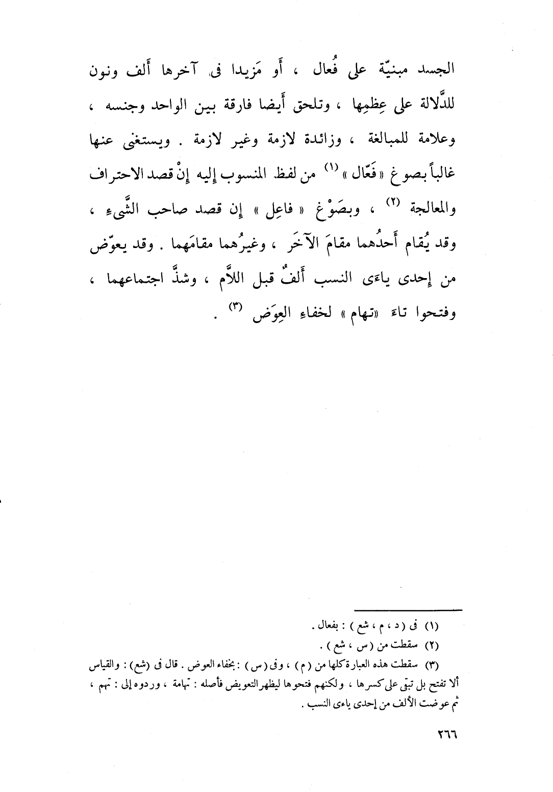 الجسد مبنية على فعال، او مزيدا في اخرها الف ونون للدلالة على عظمها، وتلحق ـ ايضا ـ فارقة بينا واحد وجنسه، وعلامة للمبالغة وزائدة لازمة وغير لازمة، ويستغنى عنها غالبا بـ “ فعال “ من لفظ المنسوب اليه ان قصد الاحتراف وبصوغ “ فاعل “ ان قصد صاحب الشيء، وقد يقام احدهما مقام الاخر وغيرهما مقامهما، وقد يعوض من احدى ياءي النسب الف قبل اللام، وشذ اجتماعهما وفتحوا تاء تهام؛ لخفاء العوض.