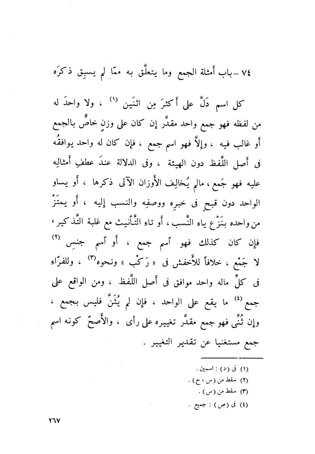 كل اسم دل على اكثر من اثنين ولا واحد له من لفظه، فهو جمع واحد مقدر ان كان على وزن خاص بالجمع او غالب فيه، والا فهو اسم جمع؛ فإن كان له واحد يوافقه في اصل اللفظ دون الهيئة، وفي الدلالة عند طف امثاله عليه، فهو جمع ما لم يخالف الاوزان الاتي ذكرها، او يساو الواحد دون قبح في خبره ووصفه والنسب اليه، او يمتز من واحده بنزع ياء النسب او تاء التأنيث مع غلبة التذكير. فإن كان كذلك فهو اسم جمع، او اسم جنس لا جمع، خلاف للاخفش في “ركب “، ونحوه، وللفراء في كل ما له واحد موافق في اصل اللفظ.