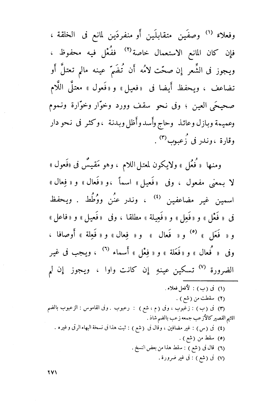 وفعلاء وصفين متقابلين او منفردين لمانع في الخلقة؛ فإن كان المانع الاستعمال خاصة، ففعل فيه محفوظ، ويجوز في الشعر ان صحت لامه ان تظم عينه ما لم تعتل او تضاعف، ويحفظ ايضا في “ فعيل “ و “ فعول “ معتلي اللام صحيحي العين، وفي نحو: سقف وورد وخوار، وخوارة، ونموم وعميمة، وبازل، وعائذ وحاج واسد، واظل، وبدنة، وكثر في نحو: دار وقارة وندر في زغبوب. ومنها: “ فعل “ ولا يكون لمعتل اللام وهو مقيس في “ فعول “ لا بمعنى مفعول، وفي “ فعيل “ اسما و “ فعال “ و “ فعال “ اسمين غير مضاعفين، وندر: عنن، ووطط، ويحفظ في “ فعل “ و “ فعل “ و “ فعيلة “ مطلقا وفي “ فعيل “ و “ فاعل “ و “ فعل “ و “ فعال “ و “ فعال “ و “ فعلة “ اوصافا، وفي “فعال “ و “ فعلة “ و “ فعل “ اسماء، ويجب في غير الضرورة تسكين عينه ان كانت واوا، ويجوز ان لم
