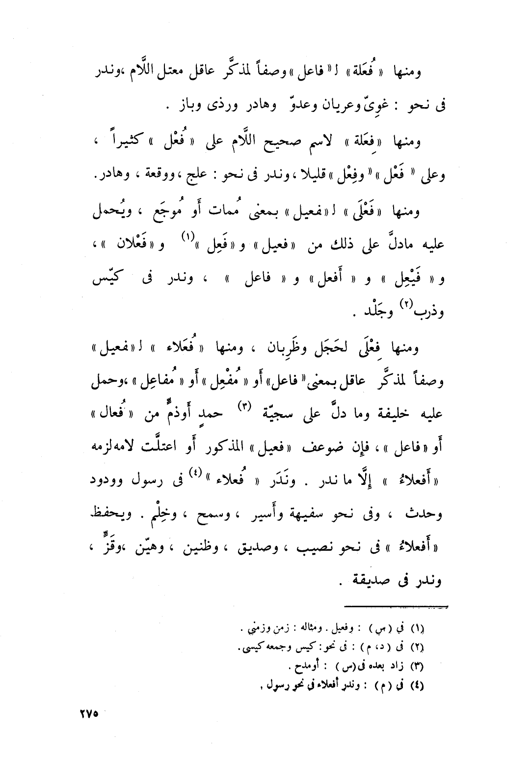 ومنها: فعلة لفاعل وصفا لمذكر عاقل معتل اللام وندر في نحو: “ غوي “ وعريان، وعدو، وهادر، وري، وباز. ومنها: فعلة لاسم صحيح اللام على فعل كثيرا، وعلى فعل وفعل قليلا، وندر في نحو: علج، ووقعة وهادر.