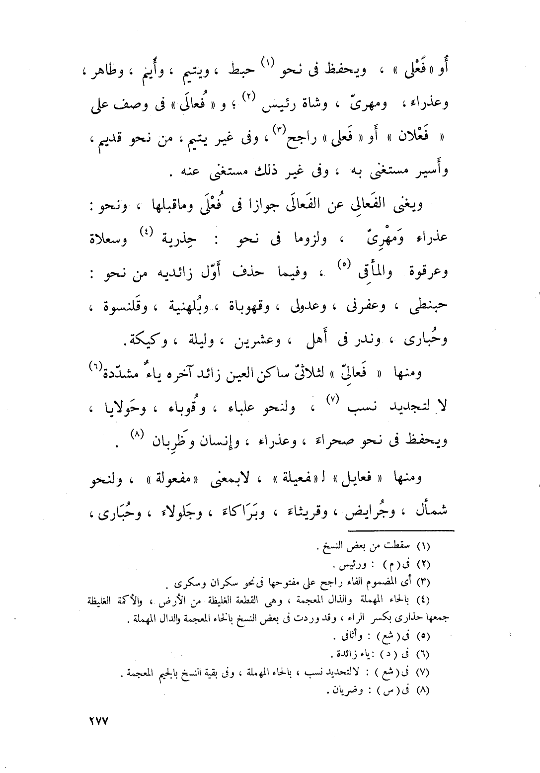 او فعلى، ويحفظ في نحو: حبط، ويتيم وايم وظاهر وعذراء ومهري وشاة رئيس وفعالي في وصف على فعلان او فعلى راجح، وفي غير يتيم من نحو: قديم واسير مستغنى به، وفي غير ذلك مستغنى عنه، ويغني الفعالي عن الفعالى جوازا في فعلى وما قبلها، ونحو: عذراء ومهري ولزوما في نحو: حذرية وسعلاة ورقوة والماقي، وفيما حذف اول زائديه من نحو: حبنطى وعفرنى وعدولى وقهوباة وبلهنية وقلنسوة وحبارى، وندر في اهل وعشرين وليلة وكيكة.