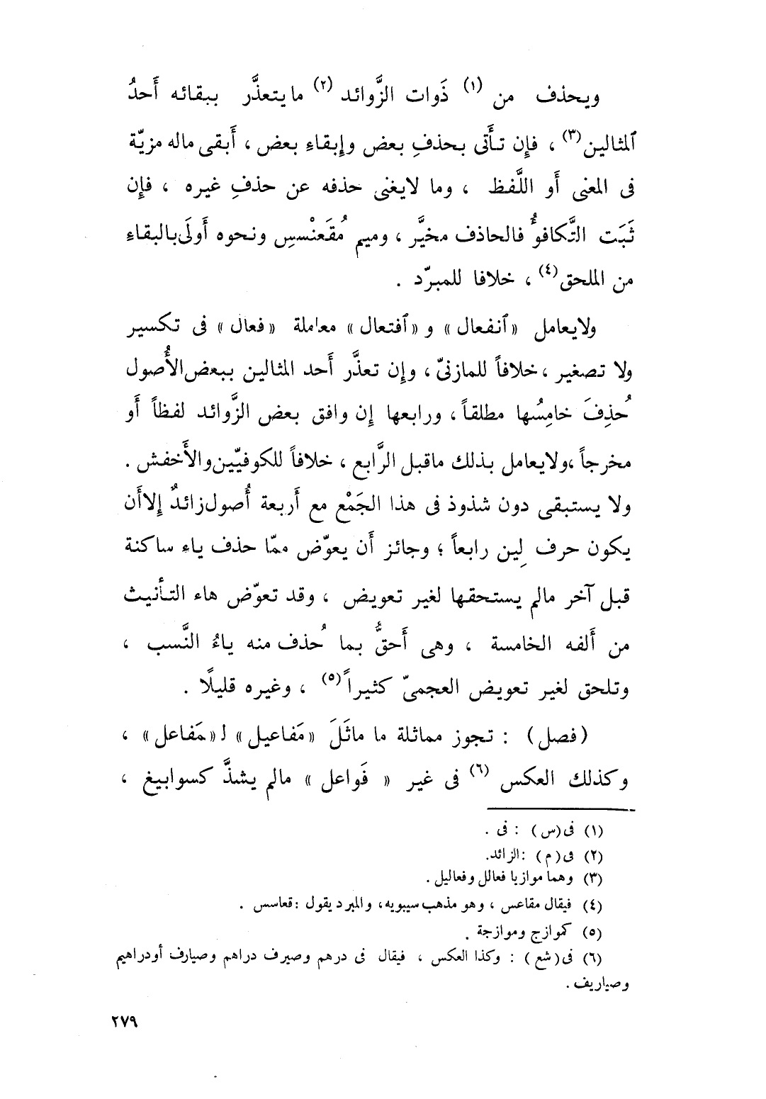 ويحذف من ذوات الزوائد ما يتعذر ببقائه احد المثالين؛ فإن تأتى بحذف بعض وابقاء بعض ابقي ما له مزية في المعنى او اللفظ، وما لا يغني حذفه عن حذف غيره، فإن ثبت التكافؤ فالحاذق مخير، وميم: مقعنسس ونحوه اولى بالبقاء من المحلق، خلافا للمبرد. ولا يعامل انفعال وافتعال معاملة فعال في تكسير ولا تصغير، خلافا للمازني. وان تعذر احد المثالين ببعض الاصول حذف خامسها مطلقا، ورباعها ان وافق بعض الزوائد لفظا او مخرجا، ولا يعامل بذلك ما قبل الرابع خلافا للكوفيين والاخفش. ولا يستبقى دون شذوذ في هذا الجمع اربعة اصول زائد الا ان يكون حرف لين رابعا. وجائز ان يعوض مما حذف ياء ساكنة قبل اخر، ما لم يستحقها لغير تعويض،