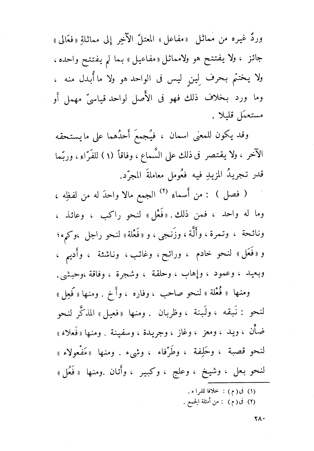 ورد غيره من مماثل مفاعل المعتل الاخر الى مماثلة فعالى جائز، ولا يفتتح هو ولا مماثل مفاعيل بما لم يفتتح واحده ولا يختتم بحرف لين ليس في الواحد هو ولا ما ابدل منه، وما ورد بخلاف ذلك فهو في الاصل لواحد قياسي مهمل او مستعمل قليلا، وقد يكون للمعنى اسمان فيجمع احدهما على ما يستحقه الاخر ولا يقتصر في ذلك على السماع وفاقا للفراء، وربما قدر تجريد المزيد فيه فعومل معاملة المجرد.