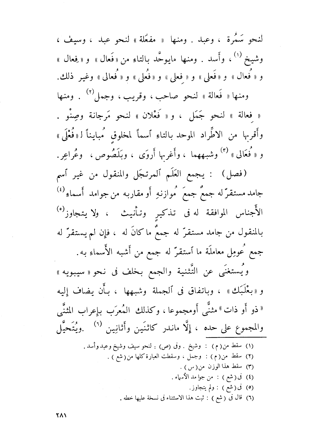 يجمع العلم المرتجل والمنقول من غير اسم جامد مستقر له جمع جمع موازنه او مقاربه من جوامد اسماء الاجناس الموافقة له في تذكير وتأنيث. ولا يتجاوز بالمنقول من جامد مستقر له جمع ما كان له؛ فإن لم يستقر له جمع عومل معاملة ما استقر له جمع من اشبه الاسماء به. ويستغنى عن التثنية والجمع بخلف في نحو: “ سيبويه “ وبعلبك. وباتفاق في الجملة وشبهها؛ بأن يضاف اليه “ ذو او ذات “ مثنى او مجموعا، وكذلك المعرب بإعراب المثنى والمجموع على حده، الا ماندر كأثنين واثانين، ويتحيل