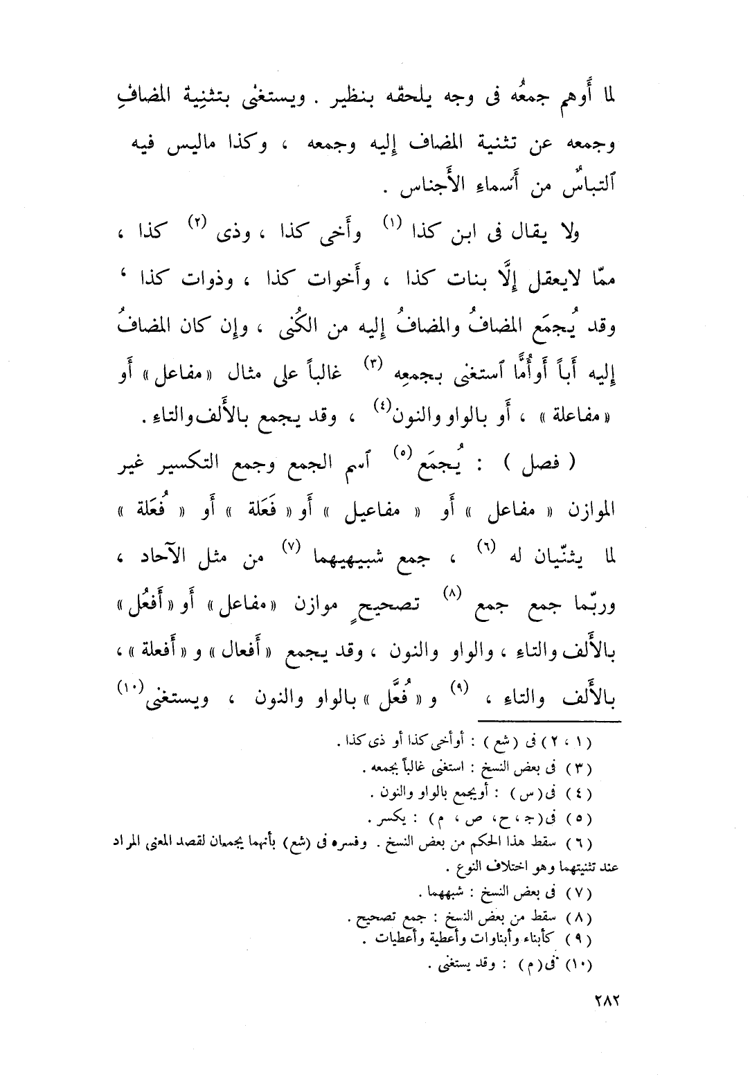 ويستغنى بتثنية المضاف وجمعه عن تثنية المضاف اليه وجمعه، وكذا ما ليس في التباس من اسماء الاجناس. ولا يقال في ابن كذا، واخي كذا، وذي كذا مما لا يعقل لا بنات كذا، واخوات كذا وذوات كذا. وقد يجمع المضاف والمضاف اليه من الكنى، وان كان المضاف اليه ابا او اما استغني بجمعه غالب على مثال “ مفاعل “ او “ مفاعلة “ او بالواو او بالنون، وقد يجمع بالالف والتاء. يجمع اسم الجمع وجمع التكسير غير الموازن “ مفاعل “ او “ مفاعيل “او “ فعلة “ او “ فعلة “ لما يثنيان له، جمع شبيهيهما من مثل الاحاد، وربما جمع جمع تصحيح موازن “ مفاعل “ او “ فعل “ بالالف والتاء، والواو والنون، وقد تجمع “ افعال “ و “ افعلة “ بالاف والتاء، و “ فعل “ بالواو والنون، ويستغنى