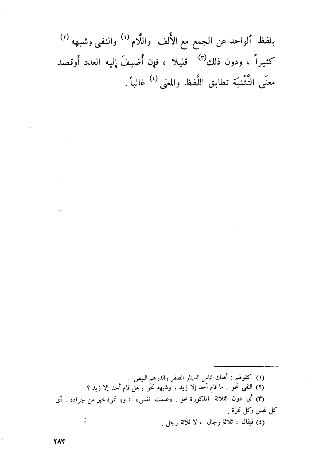 بلفظ واحد عن الجمع مع الالف واللام، والنفي وشبهه كثيرا، ودون ذلك قليلا؛ فإن اضيف اليه العد او قصد معنى التثنية تطابق اللفظ والمعنى غالبا.