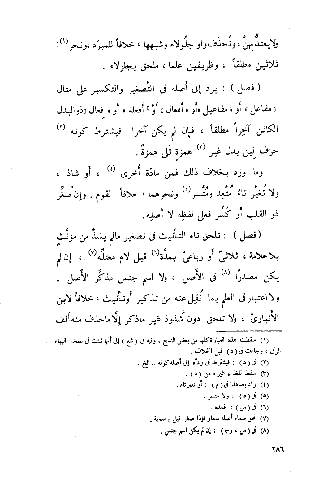 ولايعتد بهن وتحذف واو جلولاء وشبهها خلافا للمبرد ونحو: ثلاثين مطلقاً وظريفين علماً ملحق بجلولاء.