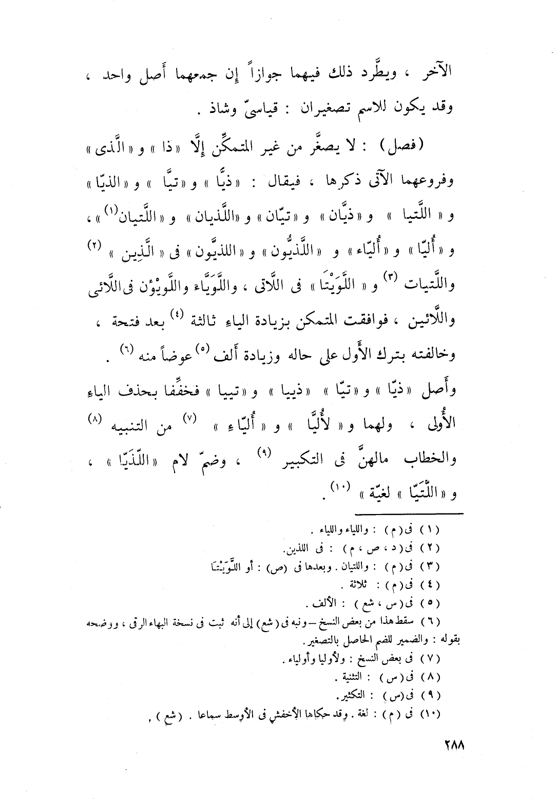 لا يصغر من غير المتمكن الا “ ذا “ و “ الذي “ وفروعهما الاتي ذكرها، فيقال: “ ذيا “ و “ تيا “ و “ اللذيا “ و “ اللتيا “ و “ ذيان “ و “ تيان “ و “ اللذيان “ و “ اللتيان “ و “ اليا “ و “ الياء “ و” اللذيون “ و “ اللذيون “ في الذين، و “ اللتيات “ و “ اللويتا “ في اللاتي، و “ اللوياء “ و “ اللويؤون “ في اللائي، واللائين، فوافقت المتمكن بزيادة الياء ثالثة بعد فتحة، وخالفته بترك الاول على حاله وزيادة الف عوضا منه. واصل “ ذيا “ و “ تيا “ و “ ذييا “ و “ تييا “ فخففاء بحذف الياء الاولى، ولهما ولـ “ اليا “ و “ الياء “ من النتبيه والخطاب ما لهن في التكبير، وضم لام “ اللذيا “ و “ اللتيا “ لغية.
