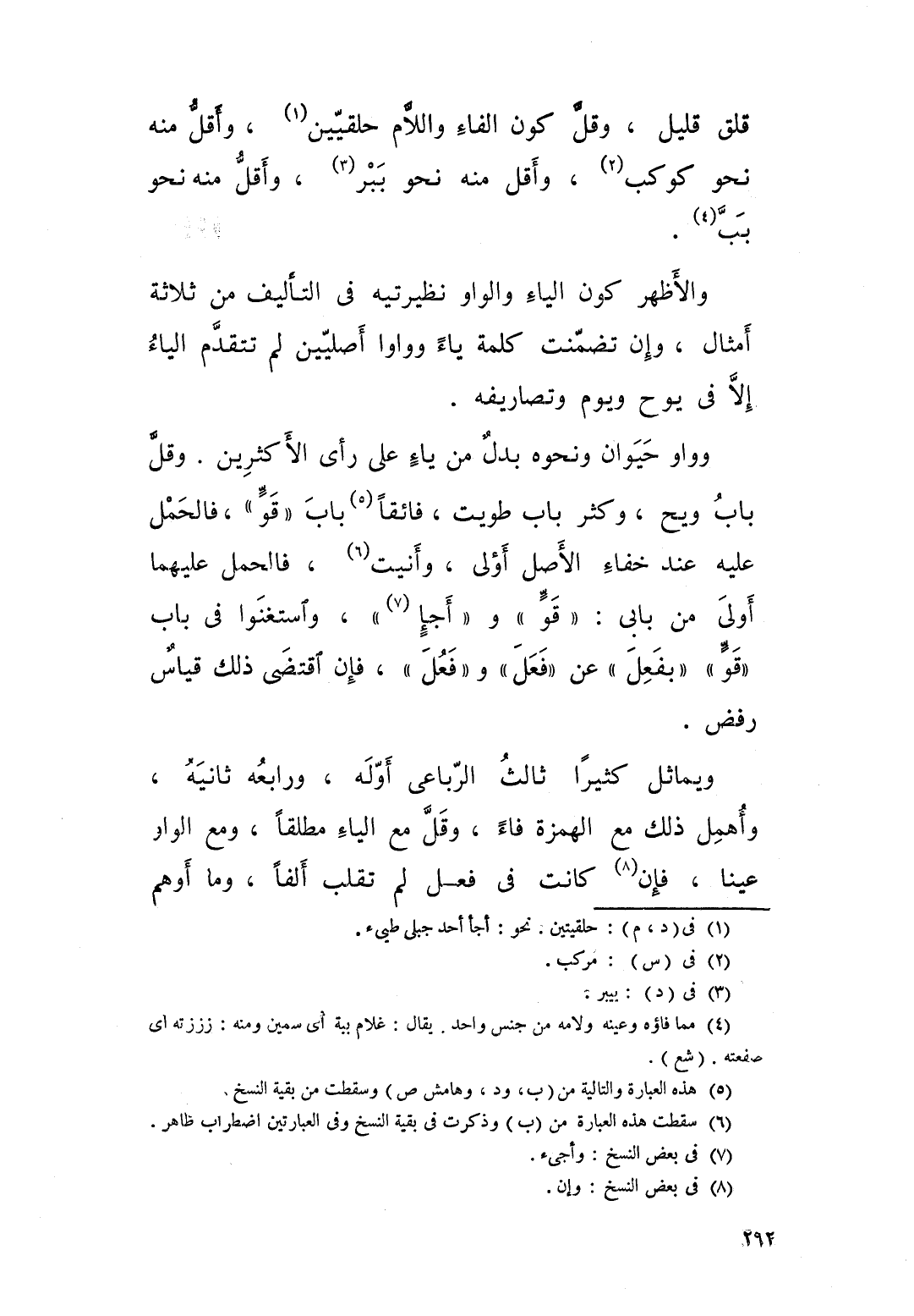 وقل كون الفاء واللام حلقيين واقل منه نحو: كوكب، واقل منه نحو: ببر واقل منه نحو: بب، والاظهر كون الياء والواو نظيرتيه في التأليف من ثلاثة امثال. وان تضمنت كلمة ياء وواوا اصليين لم تتقدم الياء الا في: يوح ويوم وتصارفه، وواو حيوان ونحوه بدل من ياء على رأي الاكثرين، وقل باب: ويح، وكثر باب: طويت.