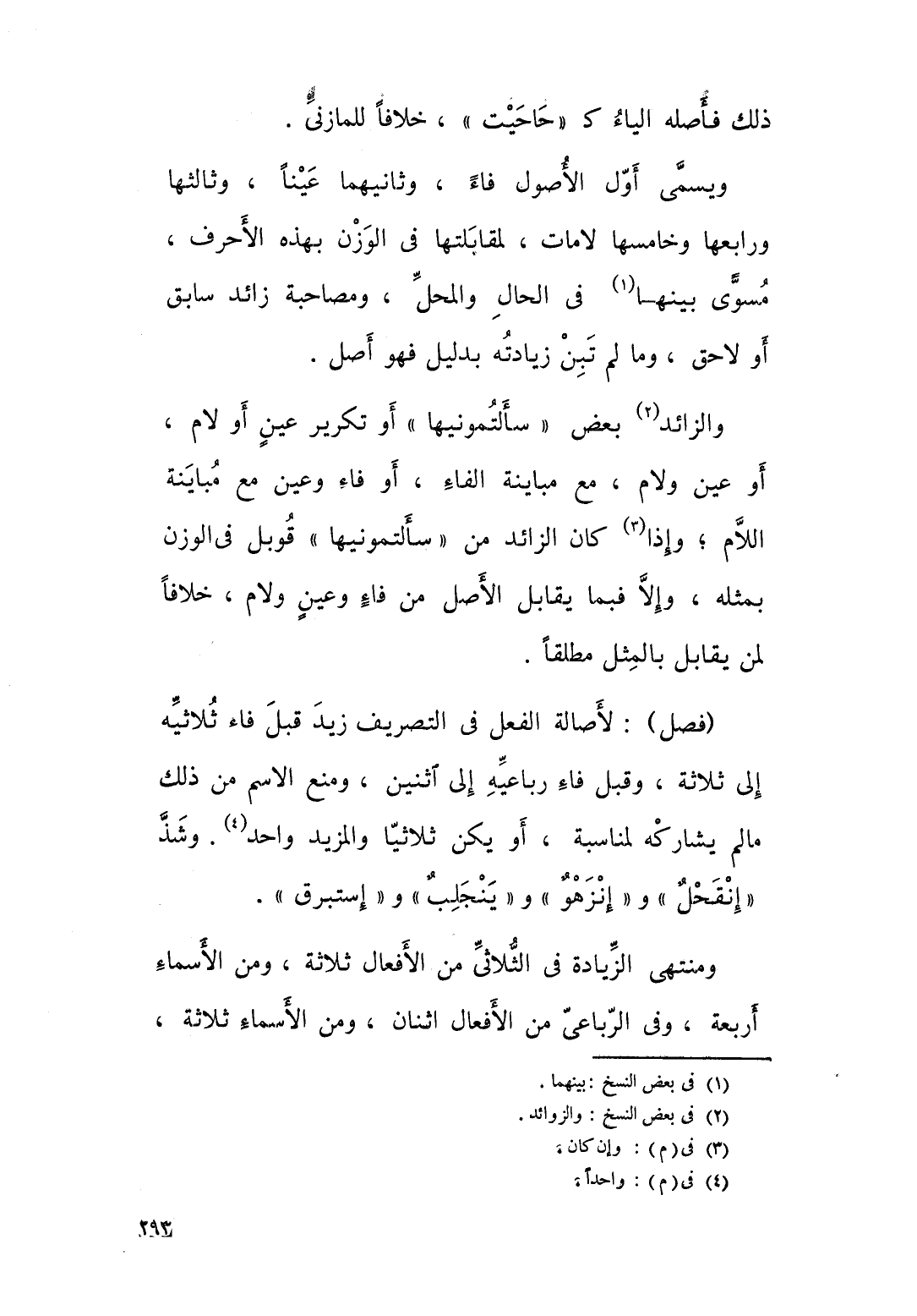 ذلك فأصله الياء كحاحيت خلافا للمازني. ويسمى اول الاصول فاء، وثانيها عينا، وثالثا ورابعها وخامسها لامات؛ لمقابلتها في الوزن بهذه الاحرف مسوى بينهما في الحال، والمحل ومصاحبة زائد وسابق او لاحق. وما لم تبن زيادته بدليل فهو اصل، والزائد بعض سألتمونيها، او تكرير عين او لام او عين ولام مع مباينة الفاء، او فاء وعين مع مباينة اللام، واذا كان الزاء من سألتمونيها قوبل بمثله في الوزن، والا فبما يقابل الاصل من فاء وعين ولام، خلافا لمن يقال بالمثل مطلقا.
