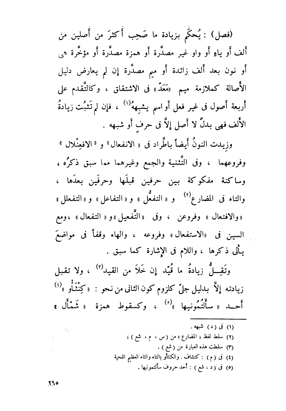 يحكم بزيادة ما صحب اكثر من اصلين من الف او ياء او واو غير مصدرة او همزة مصدرة او مؤخرة هي او نون بعد الف زائدة، او ميم مصدرة ان لم يعارض دليل الاصالة كملازمة ميم معد في الاشتقاق، وكالتقدم على اربعة اصول في غير فعل او اسم يشبهه، فإن لم تثبت زيادة الالف فهي بدل لا اصل الا في حرف او شبهه. وزيدت النون ـ ايضا ـ بإطراد في الانفعال والافعنلال وفروعهما، وفي التثنية والجمع وغيرهما مما سبق ذكره، وساكنة مفكوكة بين حرفين قبلها وحرفين بعدها، والتاء في المضارع والتفعل والتفاعل والتفعلل والافتعال وفروعهن، وفي التفعيل التفعال، ومع السين في الاستفعال وفروعه، والهاء وقفا في مواضع يأتي ذكرها واللام في الاشارة كما سبق. وتقل زيادة ما قيد ان خلا من القيد، ولا تقبل زيادته الا بدليل جلي كلزوم كون الثاني من نحو: كنثأ واحد سألتمونيها وسقوط همزة شمأل