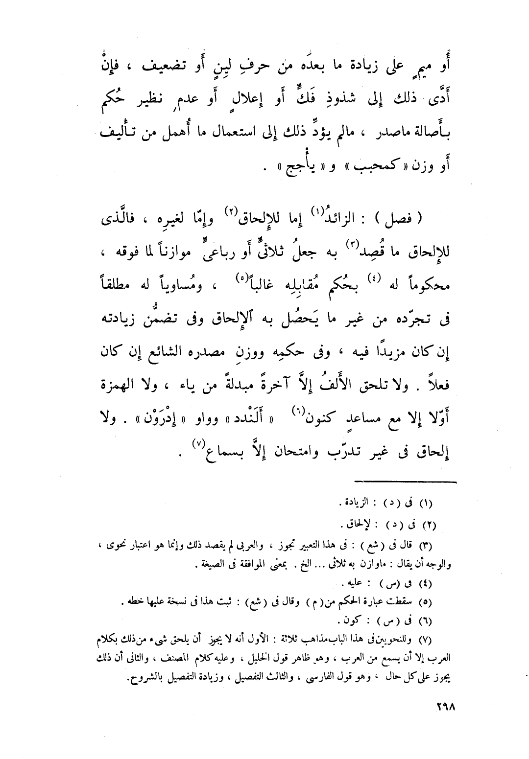 الزائد اما للالحاق واما لغيره، فالذي للالحاق ما قصد به جعل ثلاثي او رباعي موازنا لما فوقه ومساويا له مطلقا في تجرده من غير ما يحصل به الالحاق، وفي تضمن زيادته ان كان مزيدا فيه، وفي حكمه ووزن مصدره الشائع ان كان فعلا. ولا تلحق الالف الا اخرة مبدلة من ياء، ولا الهمزة اولا الا مع مساعد كنون النند وواو ادرون، ولا الحاق في غير تدرب وامتحان الا بسماع.