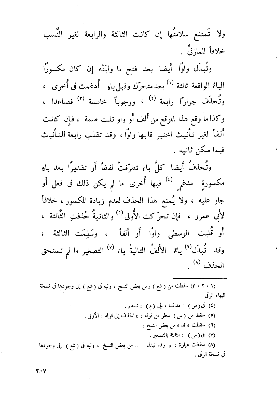وتحذف ايضا كل ياء تطرفت لفظا او تقديرا بعد ياء مكسورة مدغم فيها اخرى ما لم يكن ذلك في فعل او جار عليه، ولا يمنع هذ الحذف لعدم زيادة المكسور خلافا لأبي عمرو، فإن تحركت الاولى والثانية حذفت الثالثة او قلبت الوسطى واوا او الفا وسلمت الثالثة، وقد تبدل ياء الألف التالية ياء التصغير ما لم تستحق الحذف.
