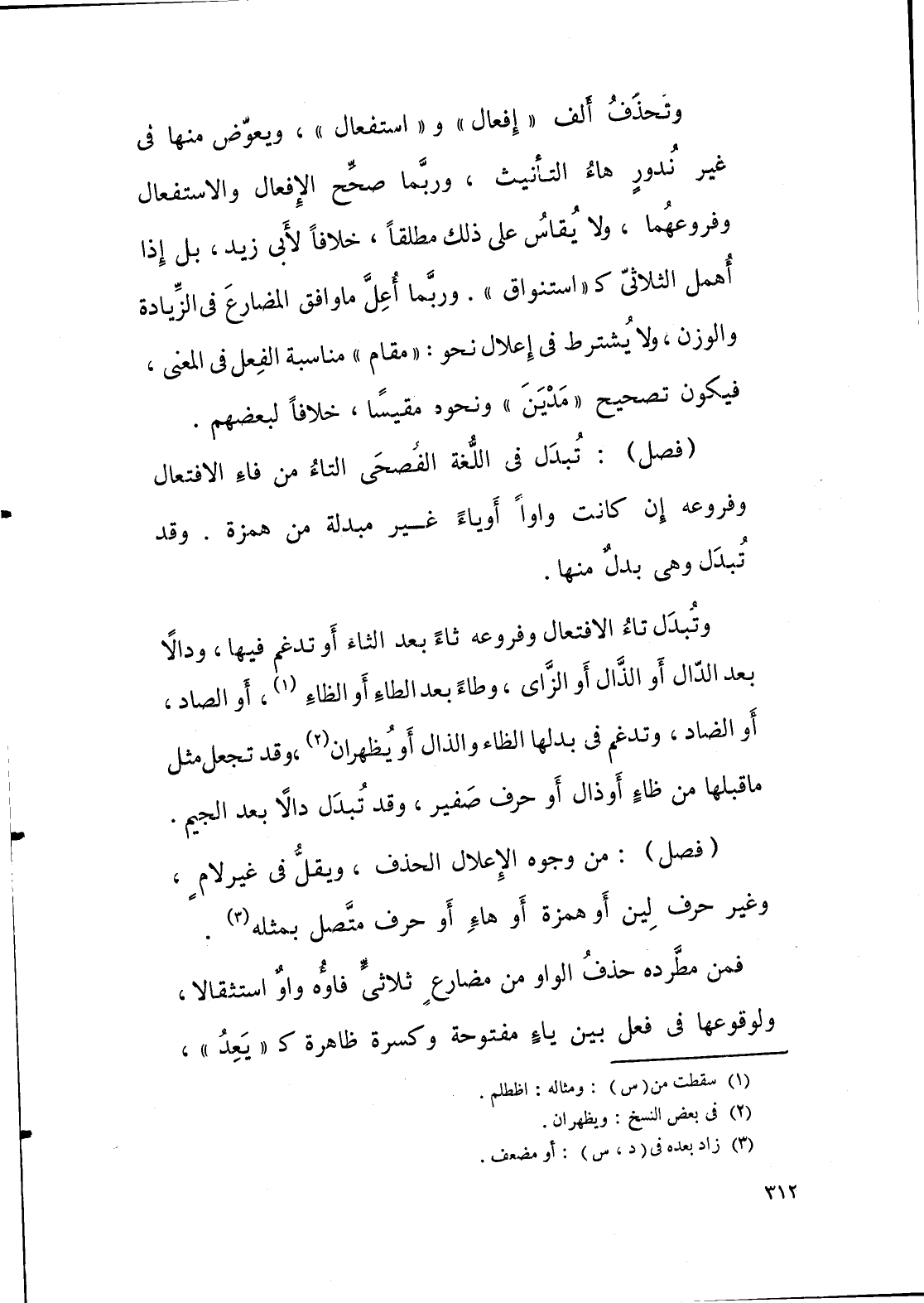 وتحذف الف افعال واستفعال، ويعوض منها في غير ندور هاء التأنيث، وربما صحح الافعال والاستفعال وفروعهما ولا يقاس على ذلك مطلقا، خلافا لأبي زيد اذا اهمل الثلاثي كاستنواق. وربما اعل ما وافق المضارع في الزيادة والوزن، ولا يشترط في اعلال نحو: مقام مناسبة الفعل في المعنى فيكون تصحيح مدين ونحوه مقيسا خلافا لبعضهم.