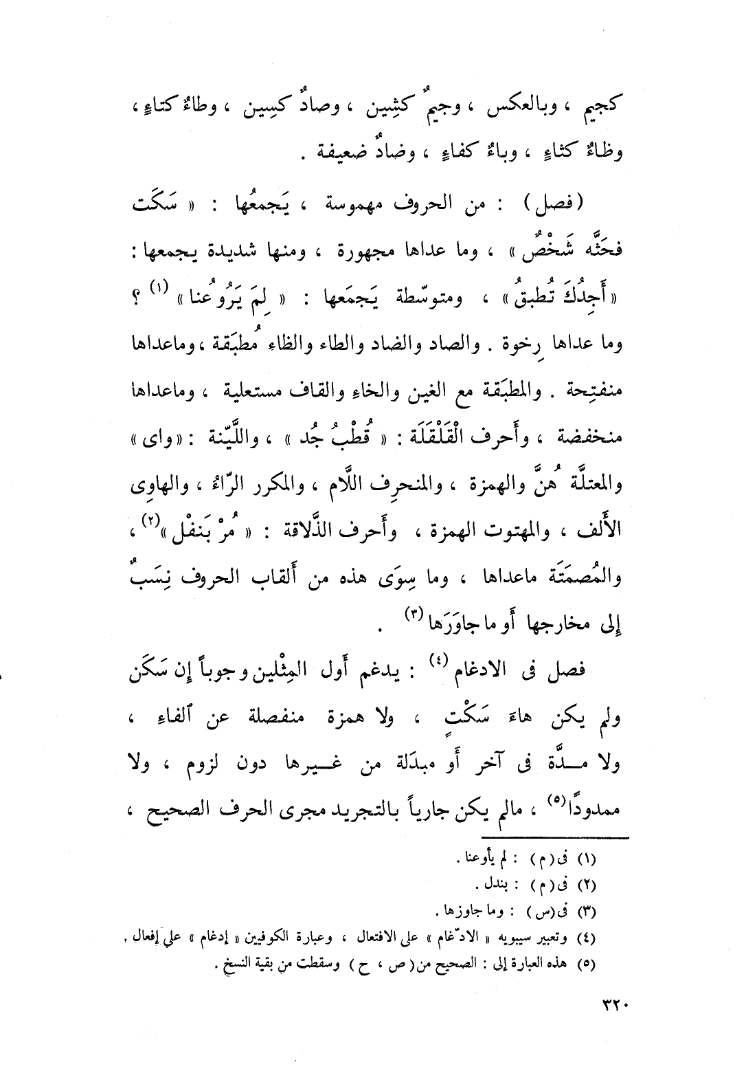 من الحروف مهموسة، يجمعها: " سكت فحثه شخص " وما عداها مهجورة، ومنها شديد يجمعها: " اجدك تطبق "، ومتوسطة يجمعها: " لم يروعنا؟ " وما عداها رخوة. والصاد والضاد والطاء والظاء مطبقة، وما عداها منفتحة، والمطبقة مع الغين والخاء والقاف مستعلية، وما عداها منخفضة، واحرف القلقلة: " قطب جد " واللينة: " واي " والمعتلة هن والهمزة، والمنحرف اللام، والمكرر الراء، والهاوي الالف والمهتوت الهمزة، واحرف الذلاقة: " مر بنفل " والمصمتة ما عداها، وما سوى هذه من القاب الحروف نسب الى مخارجها او ما جاورها.