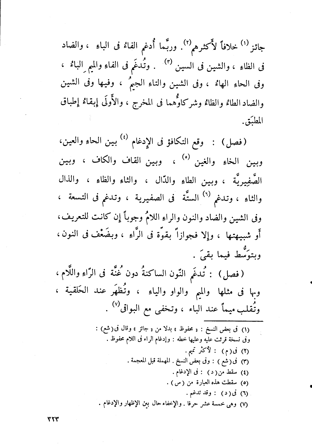 جائز خلافا لأكثرهم. وربما ادغم الفاء في الباء، والضاد في الظاء، والشين في السين، وتدغم في الفاء والميم الباء، وفي الحاء الهاء، وفي الشين والتاء الجيم، وفيها وفي الشين، والضاد الطاء والظاء وشركاؤهما في المخرج والاولى اطباق المطبق.