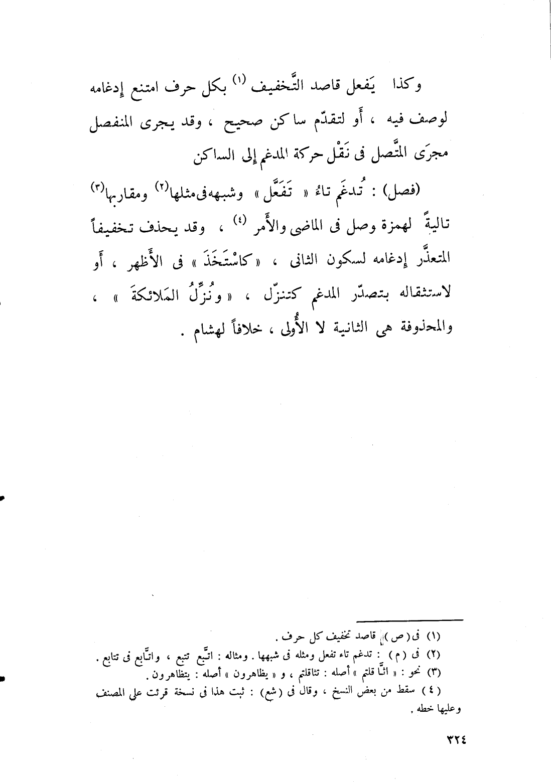 تدغم تاء " تفعل " وشبهه في مثلها، ومقاربها تالية لهمزة وصل في الماضي والامر، وقد يحذف تخفيفا المتعذر ادغامه لسكون الثاني، كاستخذ في الاظهر، او لاستثقاله بتصدر المدغم كـ " تنزل" ونزل الملائكة "، والمحذوفة هي الثانية لا الاولى، خلافا لهشام.