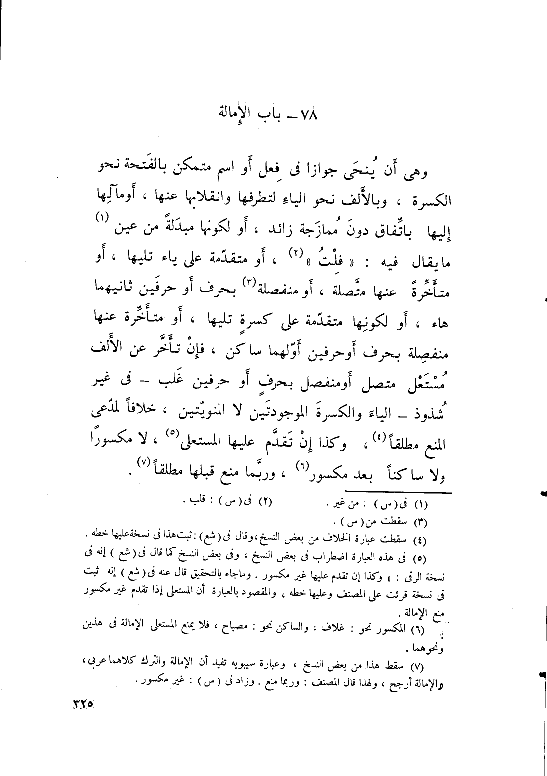 / وهي ان ينحى جوازا في فعل او اسم متمكن بالفتحة نحو الكسرة، وبالالف نحو الياء لتطرفها وانقلابها عنها، او مالها اليها باتفاق دون ممازجة زائد، او لكونها مبدلة من عين ما يقال فيه: " فلت "، او متقدمة على ياء تليها، او متأخرة عنها متصلة او منفصلة بحرف او حرفين ثانيهما هاء، او لكونها متقدمة على كسرة تليها، او متأخرة عنها منفصلة بحرف او حرفين اولهما ساكن، فإن تأخر عن الالف مستعل متصل او منفصل بحرف او حرف غلب ـ في غير شذوذ ـ الياء والكسرة الموجودتين لا المنويتين، خلافا لمدعى المنع مطلقا، وكذا ان تقدم عليها المستعلي، لا مكسورا ولا ساكنا بعد مكسور، وربما منع قبلها مطلقا.