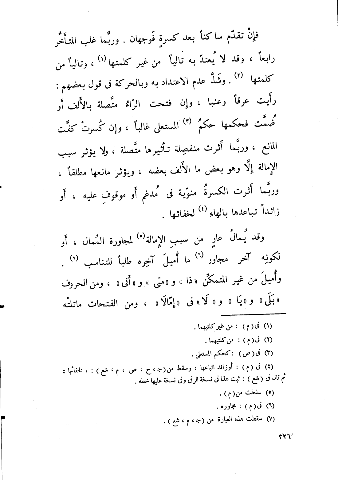 فإن تقدم ساكنا بعد كسرة فوجهان، وربما غلب المتأخر رابعا، وقد لا يعتد به تاليا من غير كلمتها، وتاليا من كلمتها وشذ عدم الاعتداد به وبالحركة في قول بعضهم: رأيت عرقا وعنبا، وان فتحت الراء متصلة بالاف او ضمت فحكمها حكم المستعلي غالبا وان كسرت كفت المانع، وربما اثرت منفصلة تأثيرها متصلة، ولا يؤثر سبب الامالة الا وهو بعض ما الالف بعضه، ويؤثر مانعها مطلقا، وربما ثرت الكسرة منوية في مدغم او موقوف عليه، او زائدا تباعدها بالهاء لخفائها.