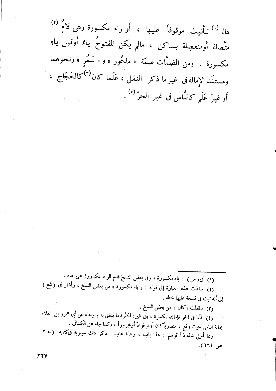 هاء تأنيث موقوفا عليها، او راء مكسورة وهي لام متصلة او منفصلة بساكن، ما لم يكن المفتوح ياء او قبل ياء مكسورة، ومن الضمات ضمة " مذعور " و " سمر " ونحوهما ومستند الامالة غفي غير ما ذكر النقل؛ علما كان كالحجاج، او غير علم كالناس في غير الجر.