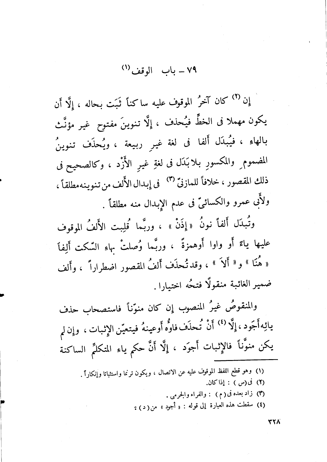 وتبدل الفا نون " اذن "، وربما قلبت الالف الموقوف عليها ياء او واوا او همزة، وربما وصلت بهاء السكت الفا " هنا " و " الا" وقد تحذف الف المقصور اضطرارا، والف ضمير الغائبة منقولا فتحة اختيارا. والمنقوص غير المنصوب ان كان منونا؛ فاستصحاب حذف يائه اجود الا ان تحذف فاؤه او عينه فيتعين الاثبات، وان لم يكن منونا فالاثبات اجود، الا ان حكم ياء المتكلم الساكنة