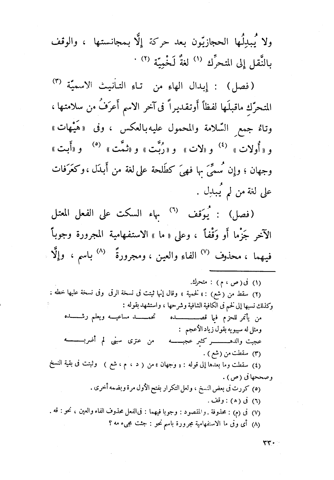 ابدال الهاء من تاء التأنيث الاسمية المتحرك ما قبلها لفظا او تقديرا في اخر الاسم اعرف من سلامتها، وتاء جمع السلامة والمحمول عليه بالعكس، وفي " هيهات " و " اولات " و " لات " و " ربت " و " ثمت " " ابت " وجهان، وان سمي بها فهي كطلحة على لغة من ابدل، وكعرفات على لغة من لم يبدل.