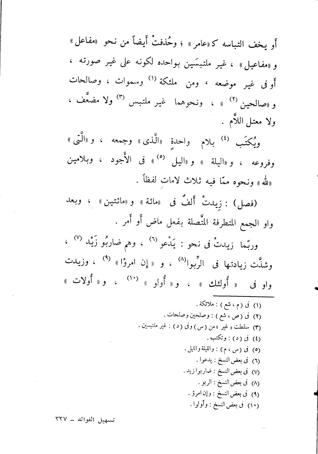 ويخف التباسه كـ “ عامر “ وحذفت ايضا من، نحو: “ مفاعل “ و “ مفاعيل “ غير ملتبسين بواحده؛ لكونه على غير صورته، او في غير موضعه، ومن “ ملئكة “ و “ سموات “، و “ صالحات “ و “ صالحين “ ونحوهما غير ملتبس ولا مضعف، ولا معتل اللام. ويكتب بلام واحدة “ الذي “ وجمعه، و “ التي “ وفروعه، و “ اليلة “ و “ الليل “ في الاجود، وبلامين “ لله “ ونحوه مما فيه ثلاث لامات لفظا.