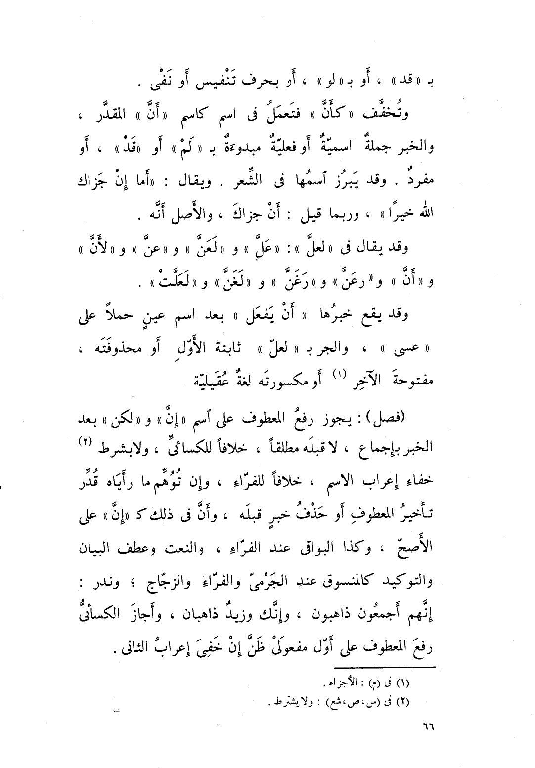 يجوزُ رفعُ المعطوفِ على اسم “إنّ “ و “ لكنّ “ بعد الخبر بإجماع لا قبله مطلقاً، خلافاً للكسائي، ولا بشرط خفاء اعراب الاسم خلافاً للفراء. وإن توهم ما رأياه قدر تأخير المعطوف او حذف خبر قبله، و “ ان “ في ذلك كـ “ان” على الاصح، وكذا البواقي عند الفراء والنعت وعطف البيان والتوكيد كالمنسوق عند الجرمي والفراء والزجاج. وندر: انهم اجمعون ذاهبون. وانك وزيد وذاهبان، واجاز الكسائي رفع المعطوف على اول مفعولي “ ظن “ ان خفي اعراب الثاني.