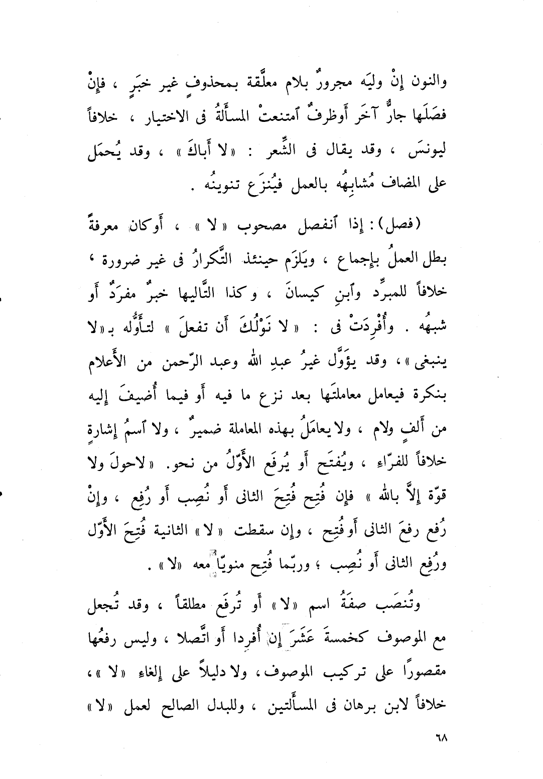 اذا انفصل مصحوب “ لا “ أو كان معرفةً بطلَ العملُ بإجماعٍ ويلزم حينئذ التكرار في غير ضرورة خلافاً للمبرد وابن كيسان، وكذا التَّاليها خبر مفرد او شبْهه وأفردتْ في: “ لا نَوْلُكَ أنْ تفعل “ لتأوِّلهِ بـ “ لا ينبغي “ وقد يُؤوَّلُ غيرُ عبد الله وعبد الرحمن من الأعلام بنكرةٍ، فيُعامل معاملتها بعد نزْعِ ما فيه او فيما أضيف اليه من ألفٍ ولامٍ، ولا يُعامل بهذه المعاملة ضميرٌ، ولا اسم اشارة خلافاً للفرّاء ويفت او يرفع الاول من نحو: “ لا حولَ ولا قوةَ إلا باللهِ “ فإن فُتح فَتح الثاني او نُصِب او رُفع، وإن رُفع رُفِع الثاني أو فُتح، وإن سَقَطَتْ “ لا “ الثانية فُتِح الاول ورُفع الثاني او نُصب، وربَّما فُتِح منوياً معه “لا “.
