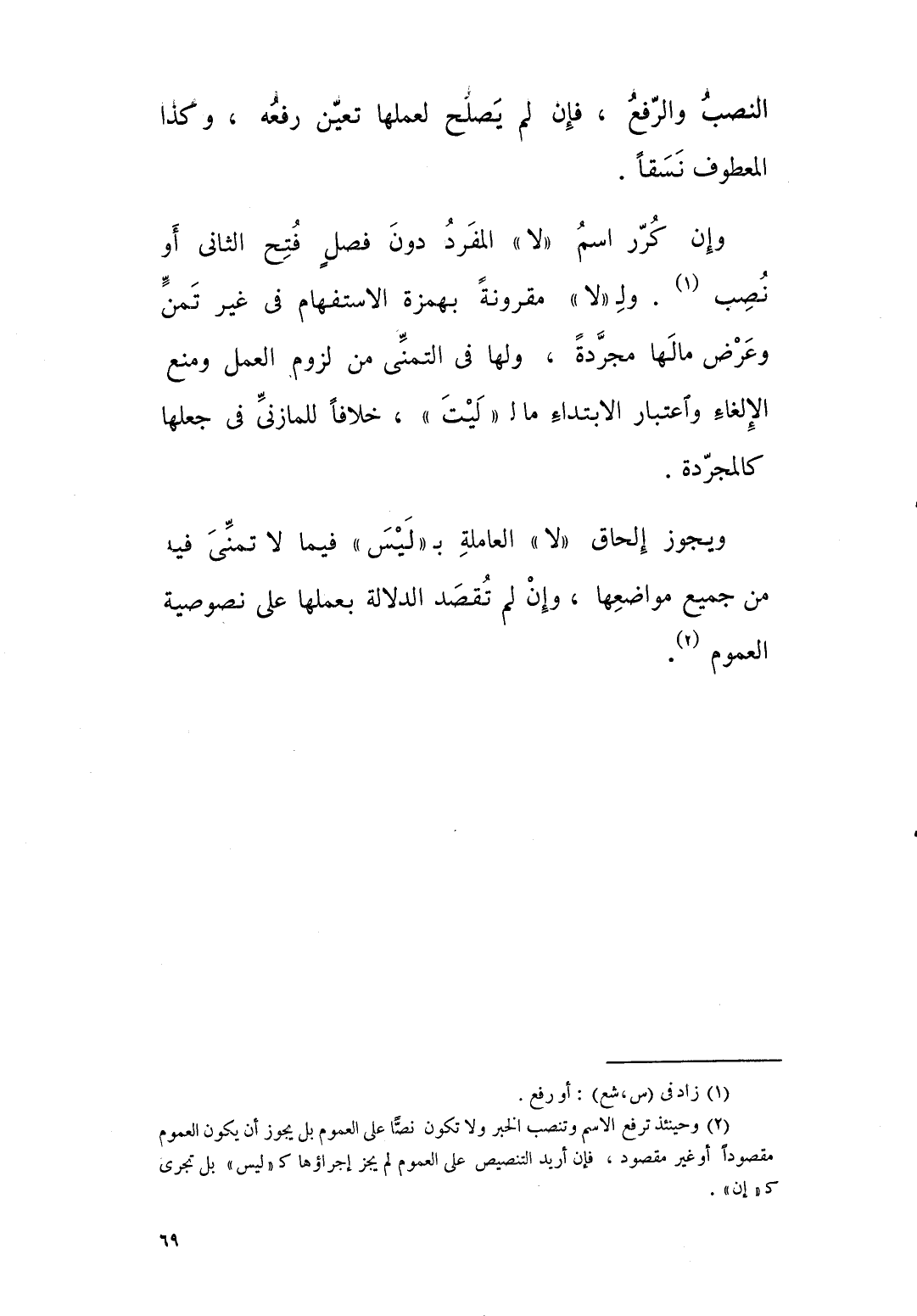 ويجوز الحاق “لا “ العاملة بليس فيما لا تمني فيه من جميع مواضعها، وان لم تقصد الدلالة بعملها على نصوصية العموم.