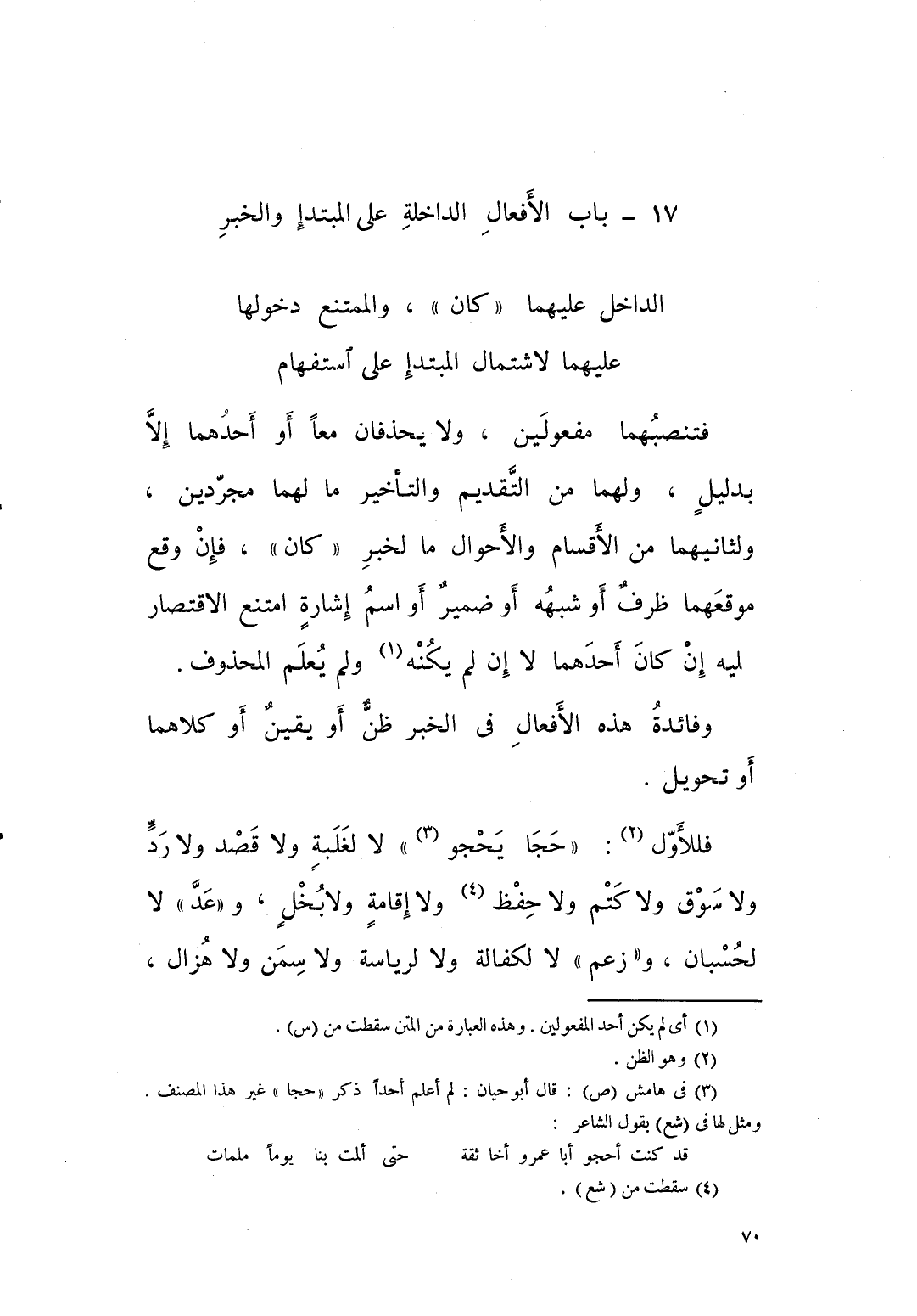 فتنصبُهُما مفعولين ولا يُحذفان معاً أو أحدهما إلا بدليلٍ ولهما مِنَ التقديم والتأخير ما لهُما مُجرّدَيْن ولِثانيهما من الاقسام والاحوال ما لخبر " كان " فإن وقع موقعهما ظرف او شبهه او ضمير او اسم اشارة امتنع الاقتصار عليه ان كان احدهما لا ان لم يكنه ولم يعلم المحذوف.