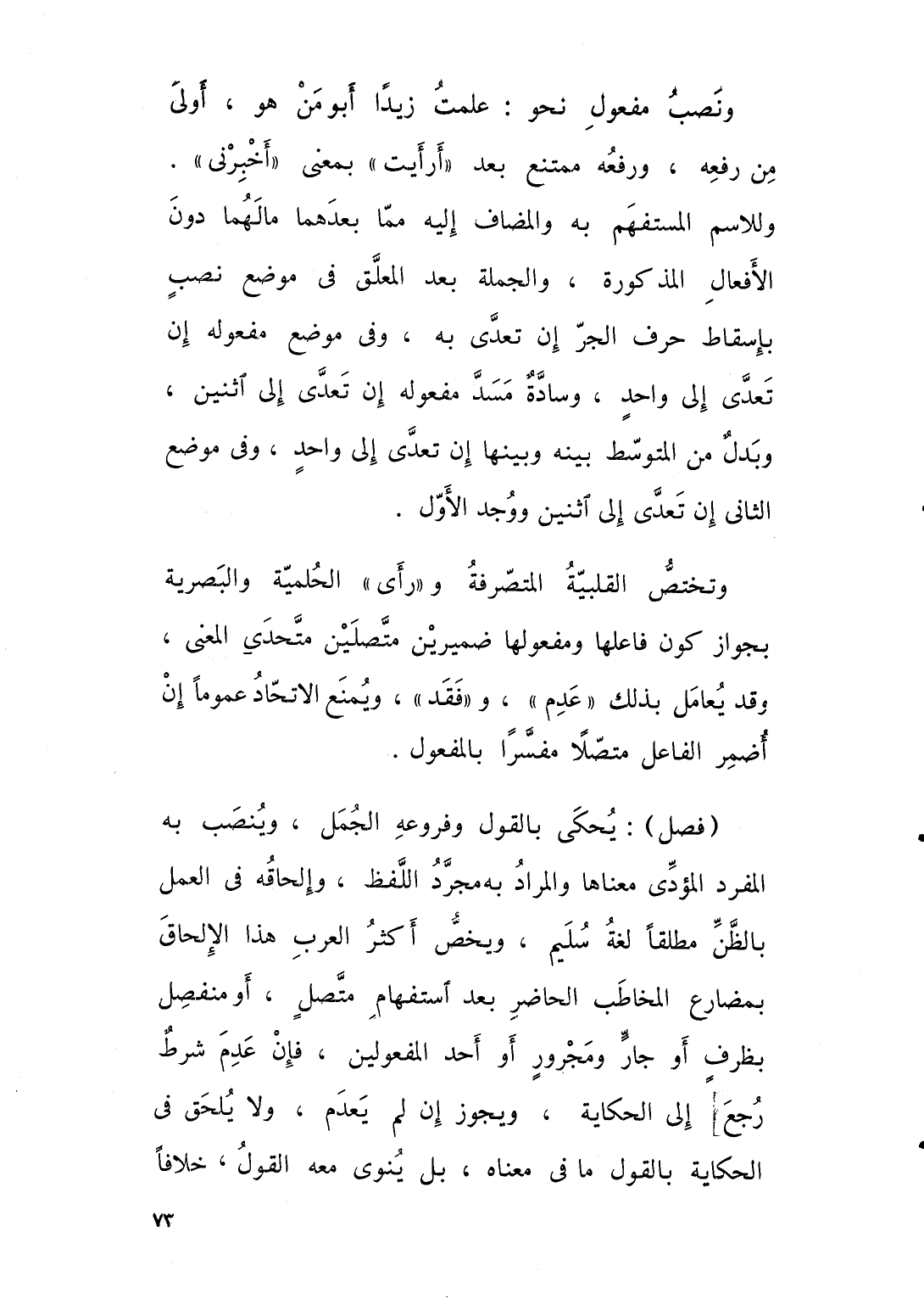 ونَصْبُ مفعولٍ نحو: علِمْتُ زيداً أبو مَنْ هو، أَوْلى مِنْ رفعه، ورفعُهُ مُمتنع بعدَ “ أرأيت “ بمعنى “ اخبرني “ وللاسم المستفهم به، والمضافِ اليه مما بعدهما ما لهما دون الافعال المذكورة. والجملةُ بعد المعلَّق في موضع نصبٍ بإسقاط حرف الجر إن تعدى به وفي موضع مفعوله ان تعدى الى واحد وسادة مسد مفعوليه الى اثنين، وبدل من المتوسط بينه وبينها ان تعدى الى واحد وفي موضع الثاني ان تعدى الى اثنين ووجد الاول.