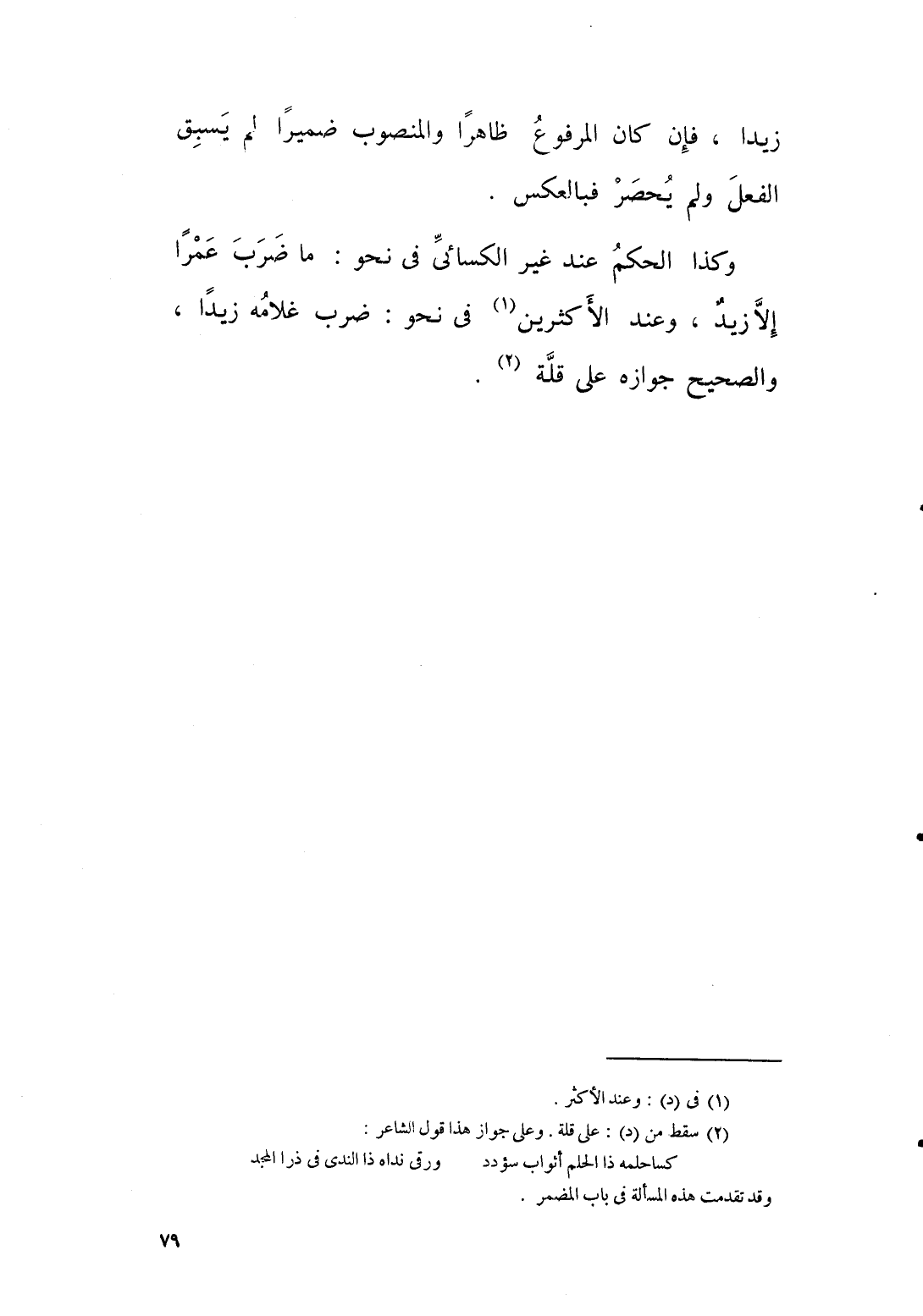 زيدا، فإن كان المرفوع ظاهرا والمنصوب ضميرا لم يسبق الفعل، ولم يحصر فبالعكس، وكذا الحكم عند غير الكسائي في نحو: ما ضرب عمرا الا زيد، وعند الاكثرين في نحو: ضرب غلامه زيدا، والصحيح جوازه على قلة.