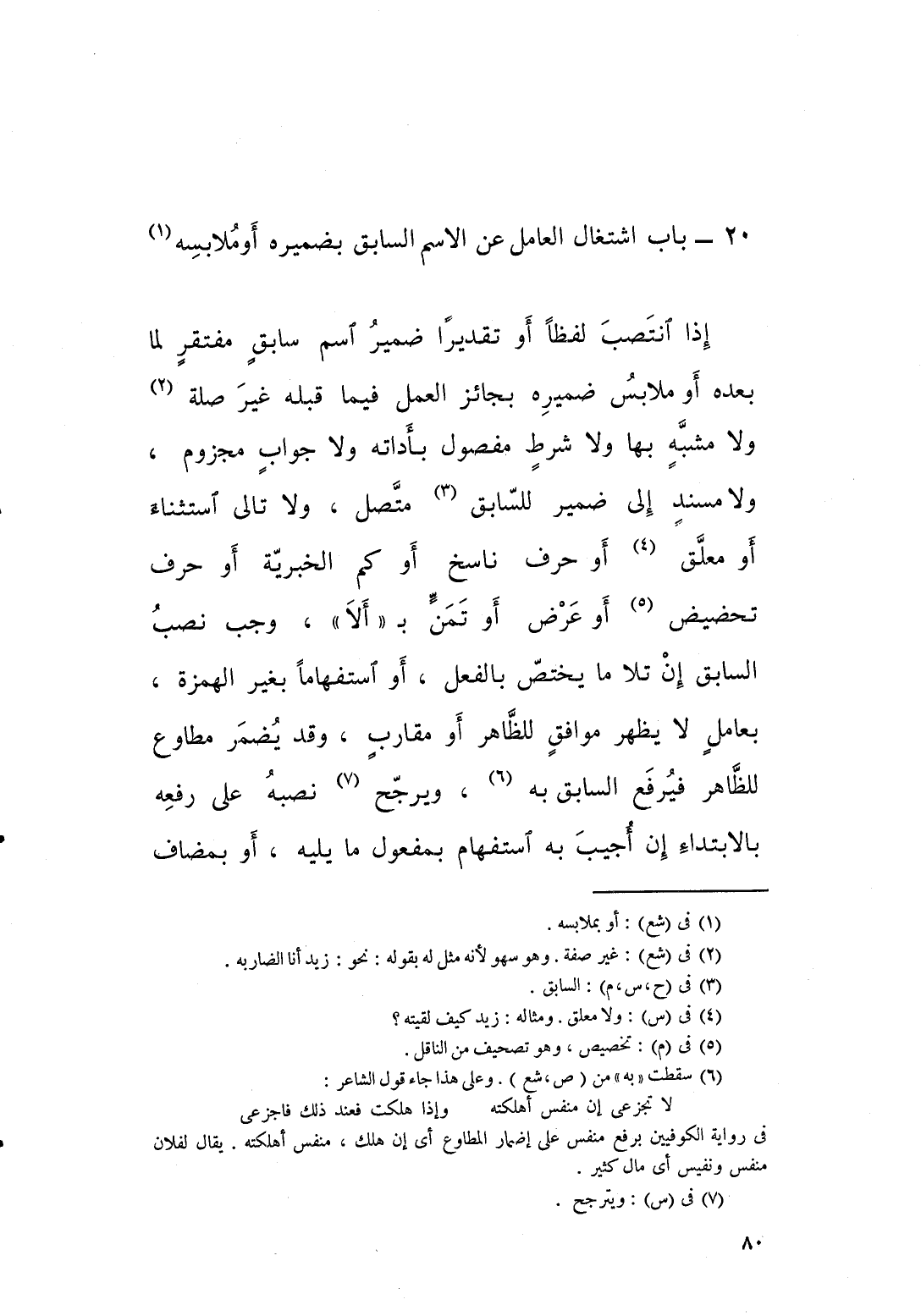 اذا انتصب لفظاً او تقديراً ضمير اسم سابق مفتقر لما بعده او ملابس ضميره بجائز العمل فيما قبله غير صلة ولا مشبه ولا شرط مفصول بأداته، ولا جوابٍ مجزوم. ولا مسند الى ضمير للسابق متصل ولا تالي استثناء او معلق او حرف ناسخ او كم الخبرية او حرف تحضيض او عرض او تمن بـ " الا " وجب نصب السابق إن تلا ما يختص بالفعل، او استفهاماً بغير الهمزة بعاملٍ لا يظهر موافق للظاهر او مقارب وقد يُضمر مطاوعٌ للظاهر فيرفَعُ السابِقُ.