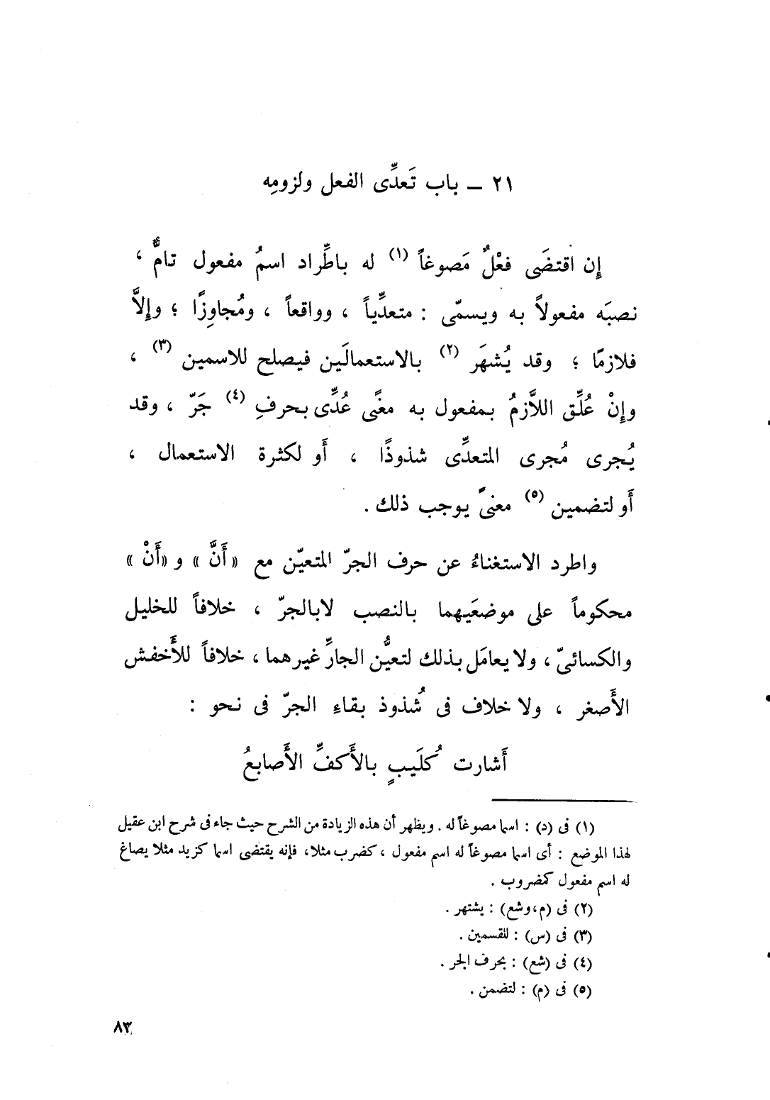 إن اقتضى فعل مصوغا له بإطراد اسم مفعول تام نصبه مفعولا به وسمي: متعديا وواقعا ومجاوزا، والا فلازما، وقد يشهر بالاستعمالين فيصلح للاسمين. وان غلق اللازم بمفعول به معنى عدي بحرف جر، وقد يجري مجرى المتعدي شذوذا، او لكثرة الاستعمال او لتضمين معنى يوجب ذلك. واطرد الاستغناء عن حرف جر المتعين مع " ان " و " ان " محكوما على موضعهما بالنصب لا بالجر، خلافا للخليل والكسائي، ولا يعامل بذلك لتعيين الجار غيرهما، خلافا للاخفش الاصغر، ولا خلافا في شذوذ بقاء الجر في نحو: