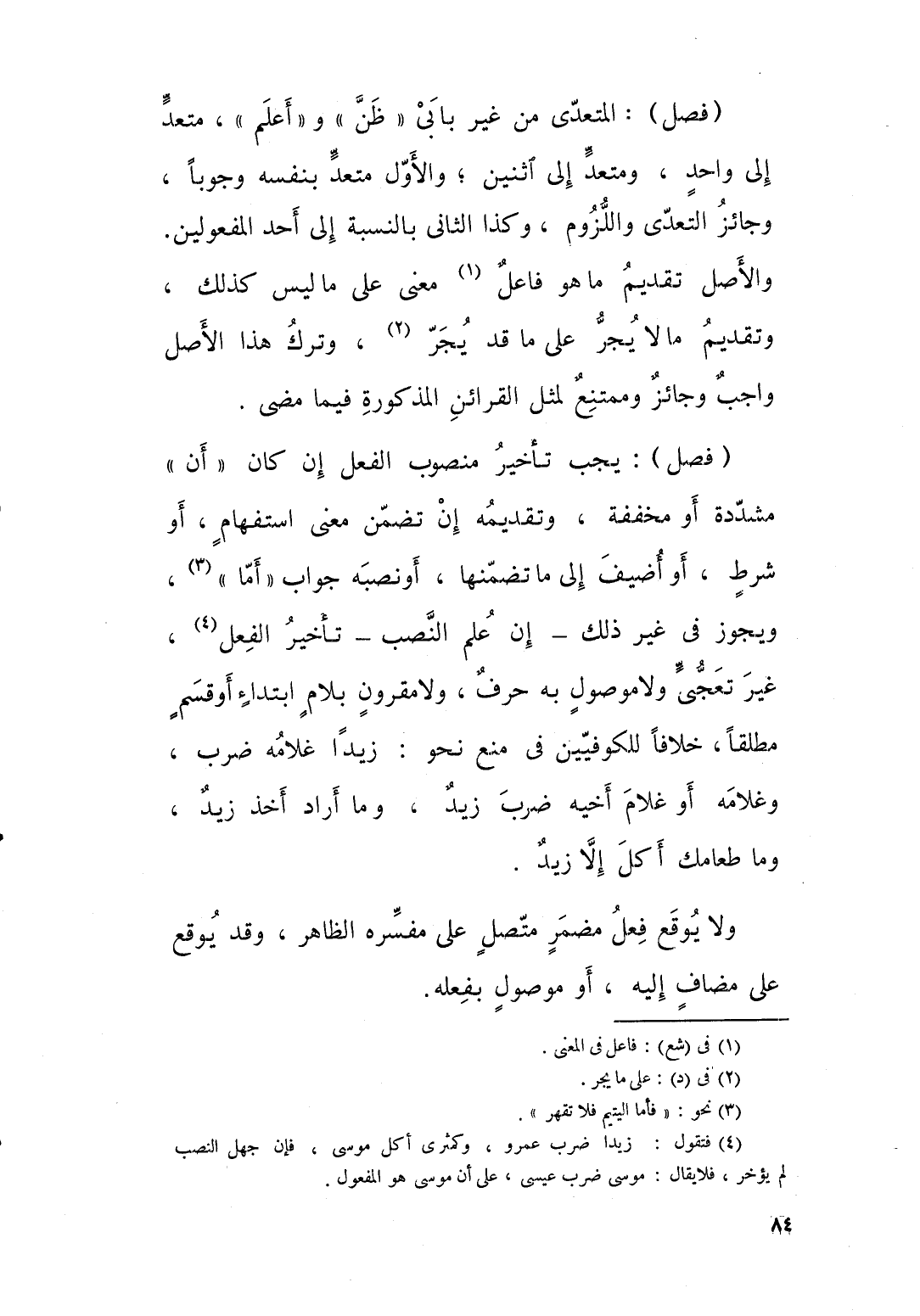 المتعدي من غير بابي “ظن “ و “ اعلم “ متعد الى واحد، ومتعد الى اثنين، والاول متعد بنفسه وجوبا، وجائز التعدي واللزوم، وكذا الثاني بالنسبة الى احد المفعولين، والاصل تقديم ما هو فاعل معنى على ما ليس كذلك، وتقديم ما قد يجر، وترك هذا الاصل واجب وجائز ممتنع لمثل القرائن المذكورة فيما مضى.