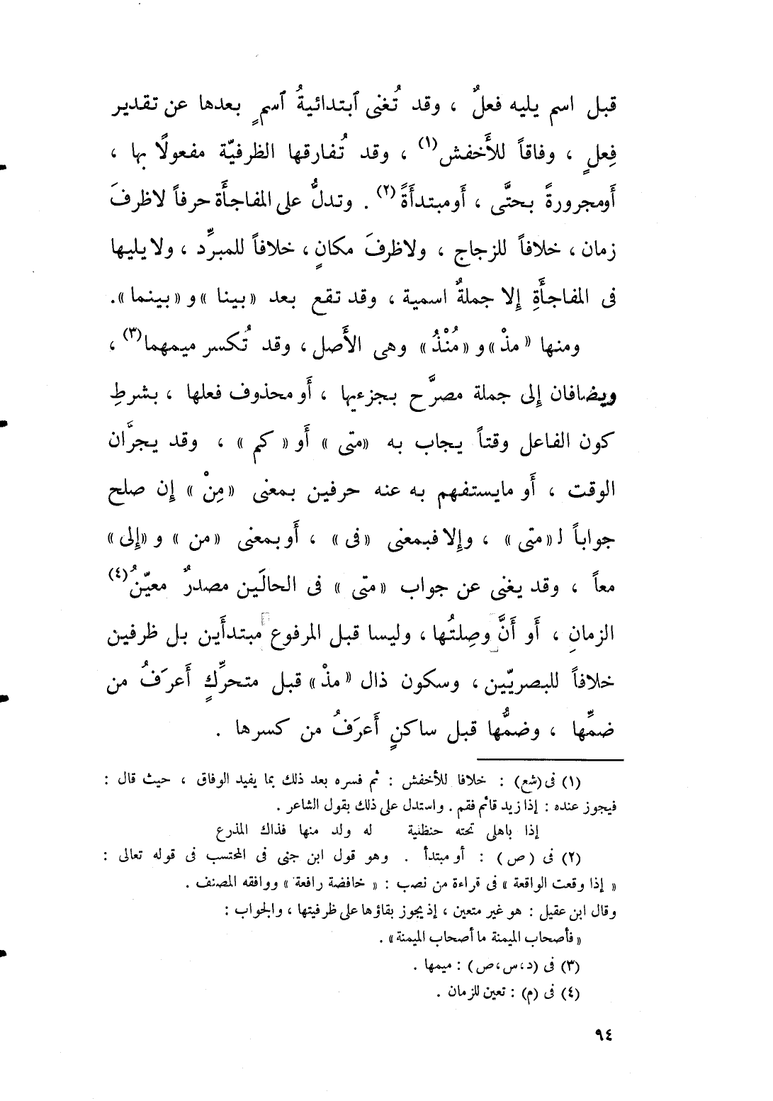 ومنها مذ ومنذ وهي الاصل، وقد تكسر ميمها ويضافان الى جملة مصرح بجزأيها او محذوف فعلها بشرط كون الفاعل وقتا يجاب به متى او كم، وقد يجران الوقت او ما يستفهم به عن حرفين بمعنى من، ان صلح جوابا لمتى، والا فبعمنى “ في “ او بمعنى “ من والى “ معا، وقد يغني عن جواب “ متى “ في الحالين مصدر معين الزمان او “ ان “ وصلتها، وليسا قبل المرفوع مبتدأين بل ظرفيين خلافا للبصريين، وسكون ذال “ مذ “ قبل متحرك اعرف من ضمها، وضمها قبل ساكن اعرف من كسرها.