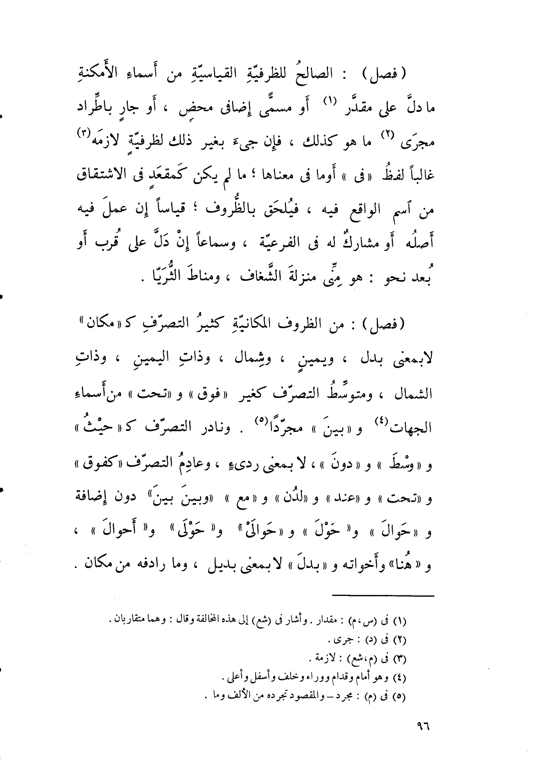 فصل: الصالح للظرفية القياسية من اسماء الامكنة ما دل على مقدر او مسمى اضافي محض او جار بإطراد مجرى ما هو كذلك، فإن جيء لغير ذلك لظرفية لازمة غالبة لفظ “ في “ او ما في معناها، ما لم يكن كمقعد في الاشتقاق من اسم الواقع فيه، فيلحق بالظروف، قياسا ان عمل فيه اصله او مشارك في الفرعية، وسماعا ان دل على قرب او بعد نحو: هو مني منزلة الشغاف ومناط الثريا.