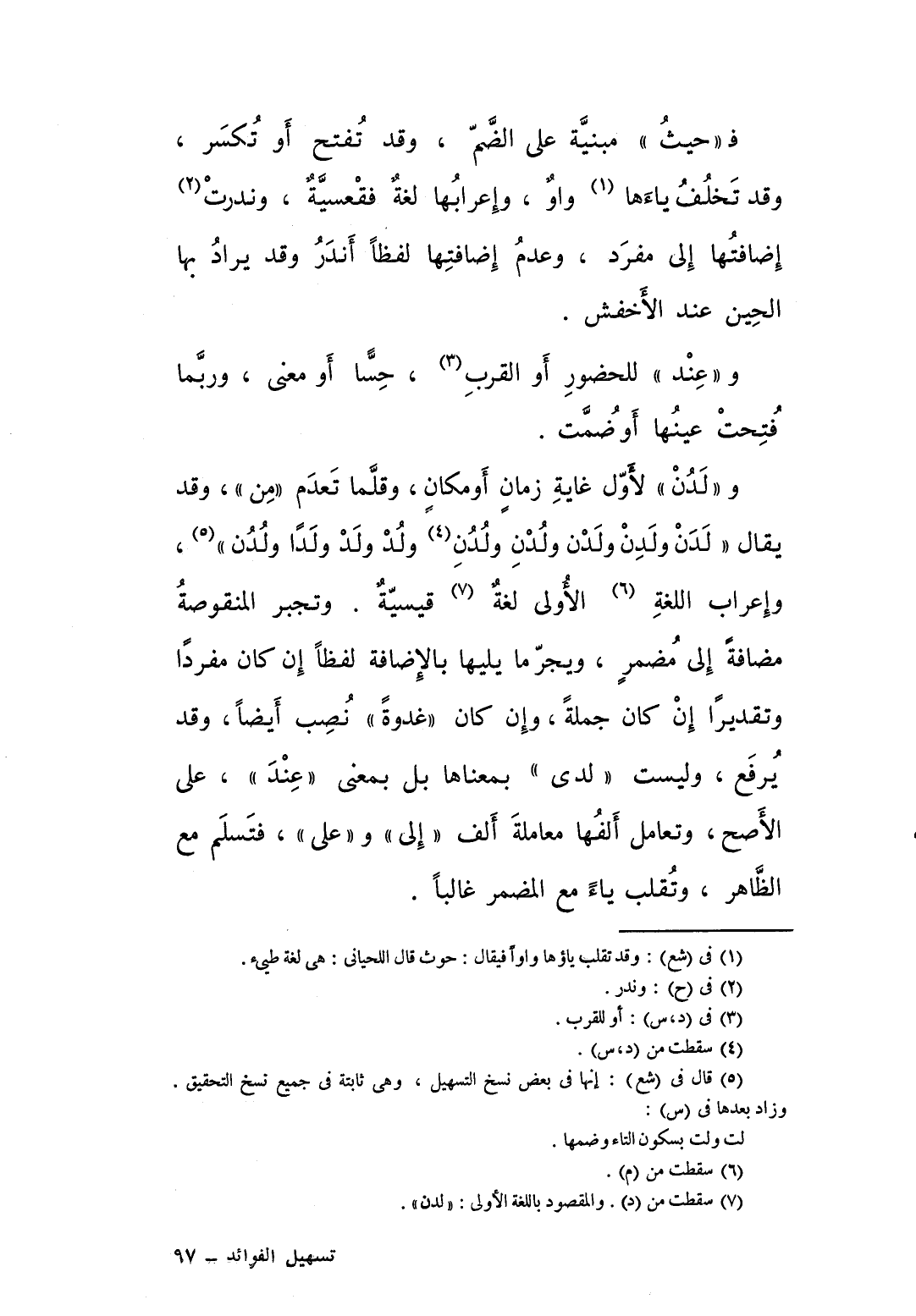 فحيث مبنية على الصم وقد تفتح او تكسر، وقد تخلف ياءها واو واعراها لغة فقعسية، وندرت اضافتها الى مفرد، وعدم اضافتها لفظا اندر، وقد يراد بها الحين عند الاخفش، و “ عند “ للحضور او القرب حسى او معنى، وربما فتحن عينها او ضمت، و” لدن “ لأول غاية زمان او مكان، وقلما تعدم “ من “ وقد يقال: لدن ولدن ولدن ولدن ولدن ولدا ولد ولد، واعراب اللغة الاولى لغة قيسية وتجبر المنقوصة مضافا الى مضمر، ويجر ما يليها بالاضافة لفظا ان كان مفردا وتقديرا ان كان جملة، وان كان “غدوة “ نصب ايضا، وقد يرفع، وليست “ لدى “ بمعناها بل معنى “ عند “ على الاصح، وتعامل الفها الف “ الى “ و “ على “ فتسلم مع الظاهر وتقلب ياء مع المضمر غالباً،