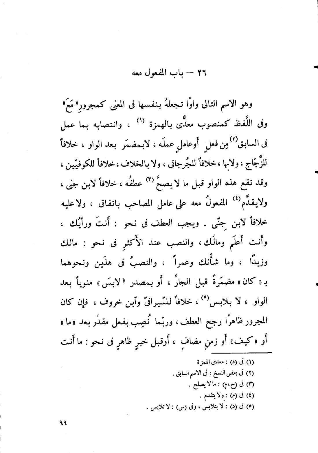 وهو التالي واو تجعلها بنفسه كمجرور مع وفي اللفظ كمنصوب معدى بالهمزة. وانتصابه فيما عمل بالسابق من فعل او عامل عمله لا بمضمر بعد الواو خلافا للزجاج، ولا بها خلافا للجرجاني، ولا بالخلاف خلافا للكوفيين. وقد تقع هذه الواو قبل ما لا يصح عطفه خلافا لأبن جني.