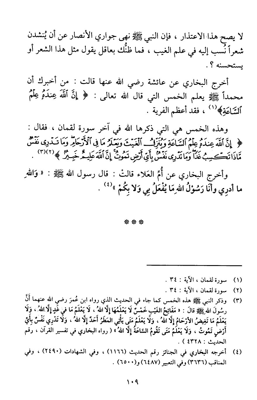 أخرج البخاري عن عائشة رضي اللَّه عنها قالت: «من أخبرك أن محمدا صلى اللَّه عليه وسلم يعلم الخمس التي قال اللَّه تعالى: {إِنَّ اللَّهَ عِنْدَهُ عِلْمُ السَّاعَةِ} [لقمان: 34] ، فقد أعظم الفرية» .