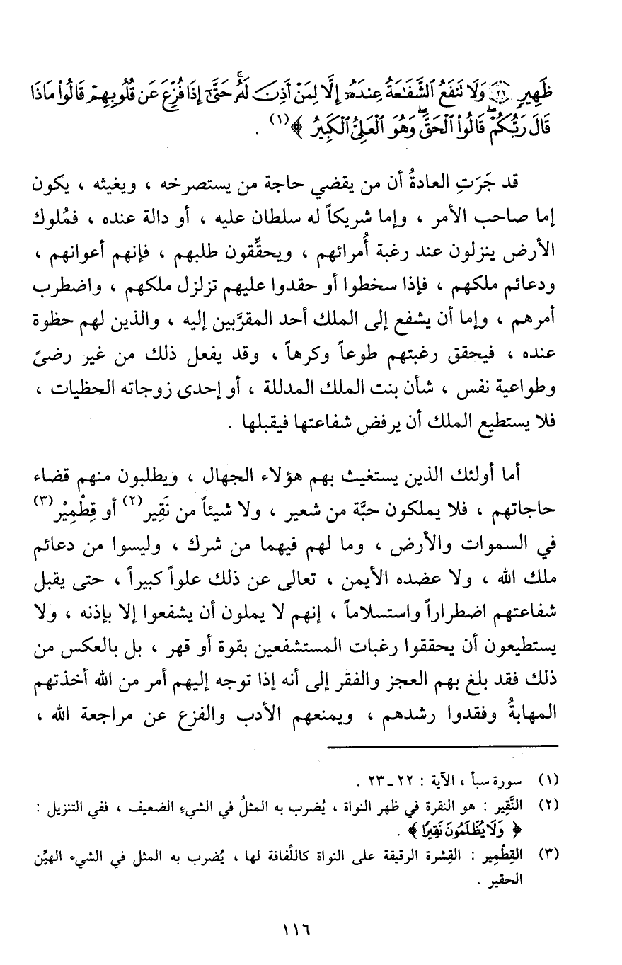 ظَهِيرٍ} {وَلَا تَنْفَعُ الشَّفَاعَةُ عِنْدَهُ إِلَّا لِمَنْ أَذِنَ لَهُ حَتَّى إِذَا فُزِّعَ عَنْ قُلُوبِهِمْ قَالُوا مَاذَا قَالَ رَبُّكُمْ قَالُوا الْحَقَّ وَهُوَ الْعَلِيُّ الْكَبِيرُ} [سبأ: 22 - 23] .