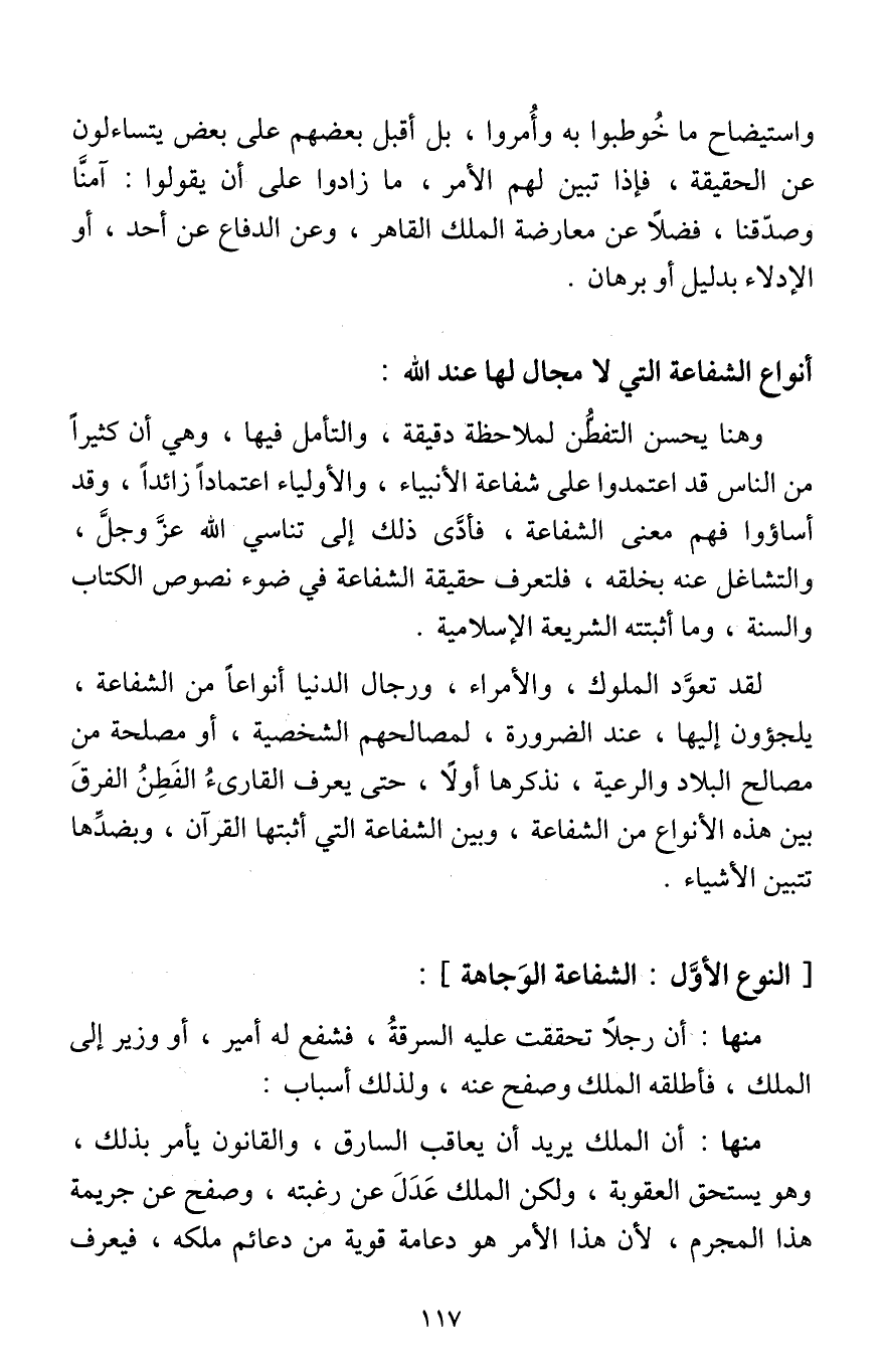 لقد تعود الملوك، والأمراء، ورجال الدنيا أنواعا من الشفاعة، يلجئون إليها عند الضرورة لمصالحهم الشخصية، أو مصلحة من مصالح البلاد والرعية، نذكرها أولا، حتى يعرف القارئ الفطن الفرق بين هذه الأنواع من الشفاعة، وبين الشفاعة التي أثبتها القرآن، وبضدها تتبين الأشياء.