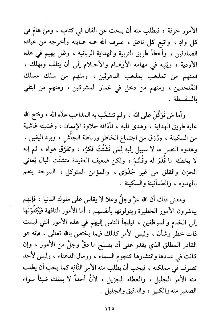 الأمور حرفة، فيطلب منه أن يبحث عن الفال في كتاب، ومن هام في كل واد، واتبع كل ناعق، صرف اللَّه عنه عنايته وأخرجه من عباده الصادقين، وأخطأ طريق التربية والهداية الربانية، وظل يهيم في هذه الأودية، ويتيه في مهامه الأوهام والأحلام إلى أن يتلف ويهلك، فمنهم من تمذهب بمذهب الدهريين، ومنهم من سلك مسلك الملحدين، ومنهم من دخل في غمار المشركين، ومنهم من ابتلي بالسفسطة.