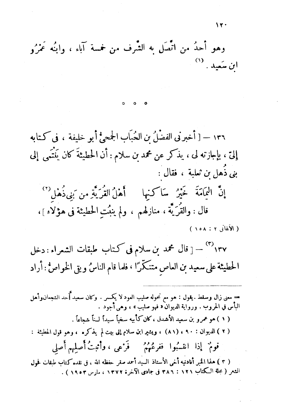 136 - أخبرنى الْفضل بن الْحباب الجمحى أَبُو خَليفَة فى كِتَابه إِلَى بإجازته لى يذكر عَن مُحَمَّد بن سَلام أَن الحطيئة كَانَ ينتمى إِلَى بنى ذهل بن ثَعْلَبَة فَقَالَ