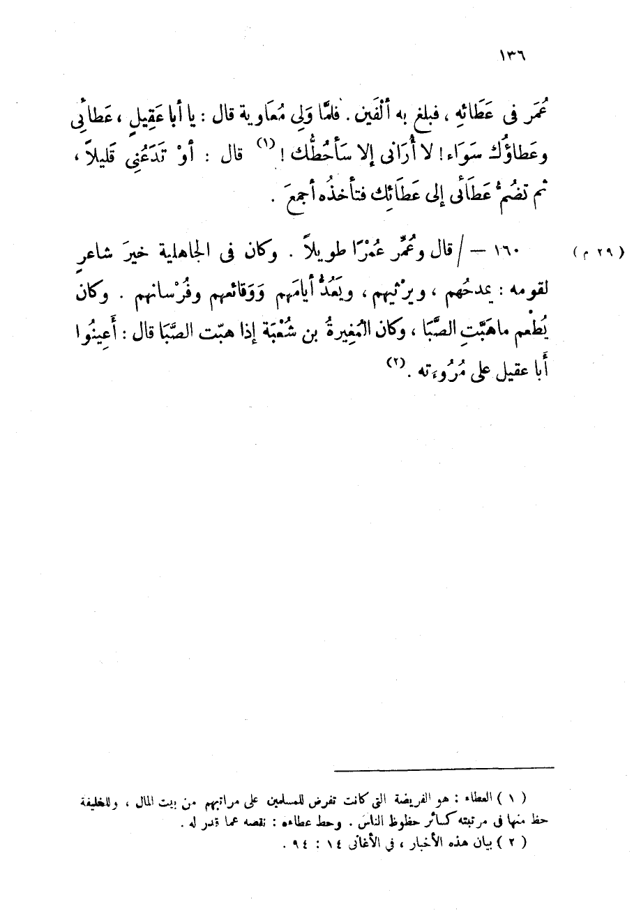 فَلَمَّا ولى مُعَاوِيَة قَالَ يَا أَبَا عقيل عطائى وعطاؤك سَوَاء لَا أرانى إِلَّا سأحطك قَالَ أَو تدعنى قَلِيلا ثمَّ تضم عطائى إِلَى عطائك فتأخذه أجمع
