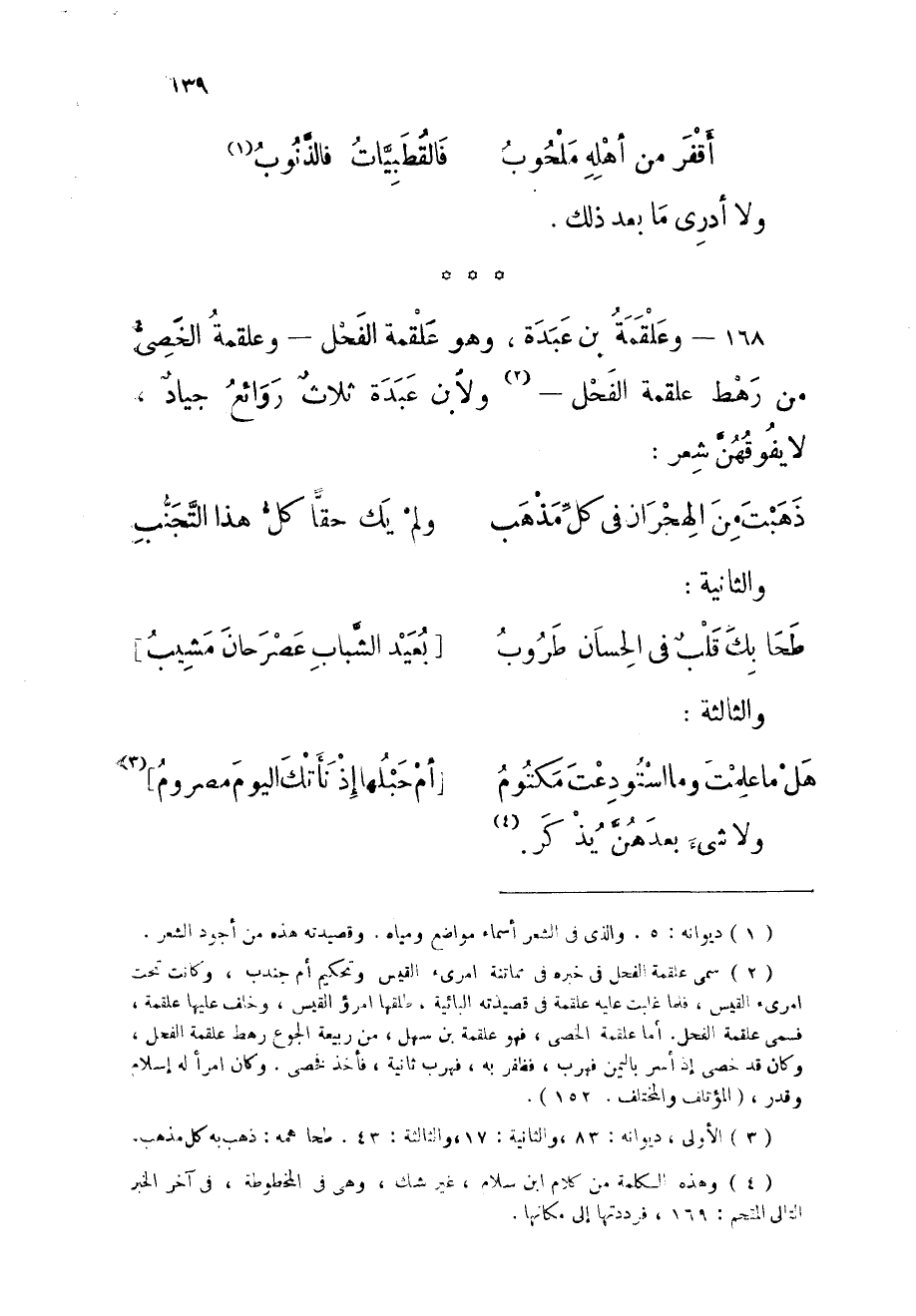 168 - وعلقمة بن عَبده وَهُوَ عَلْقَمَة الْفَحْل وعلقمة الخصى من رَهْط عَلْقَمَة الْفَحْل وَلابْن عَبدة ثَلَاث روائع جِيَاد لَا يفوقهن شعر
